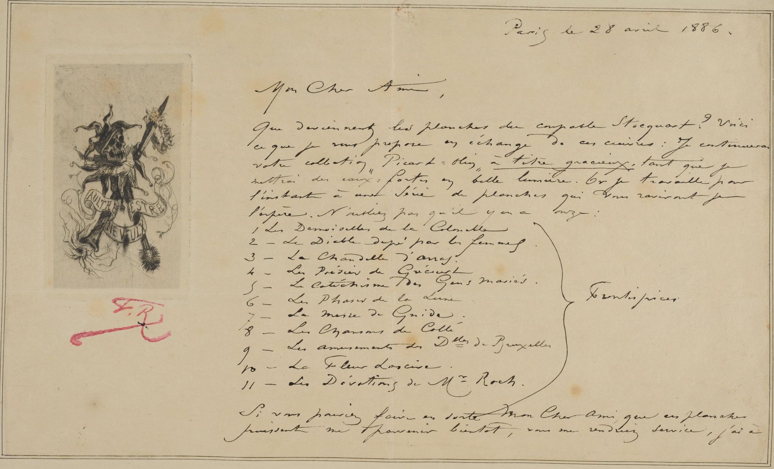 Que deviennent les planches du coupable Stocquart ? Voici ce que je vous propose en échange de ces cuivres : Je continuerai votre collection « Picart-Olin » à titre gracieux, tant que je mettrai des eaux-fortes en belle lumière. Or je travaille pour l’instant à une Série de planches qui vous raviront je l’espère. N’oubliez pas qu’il y en a onze :