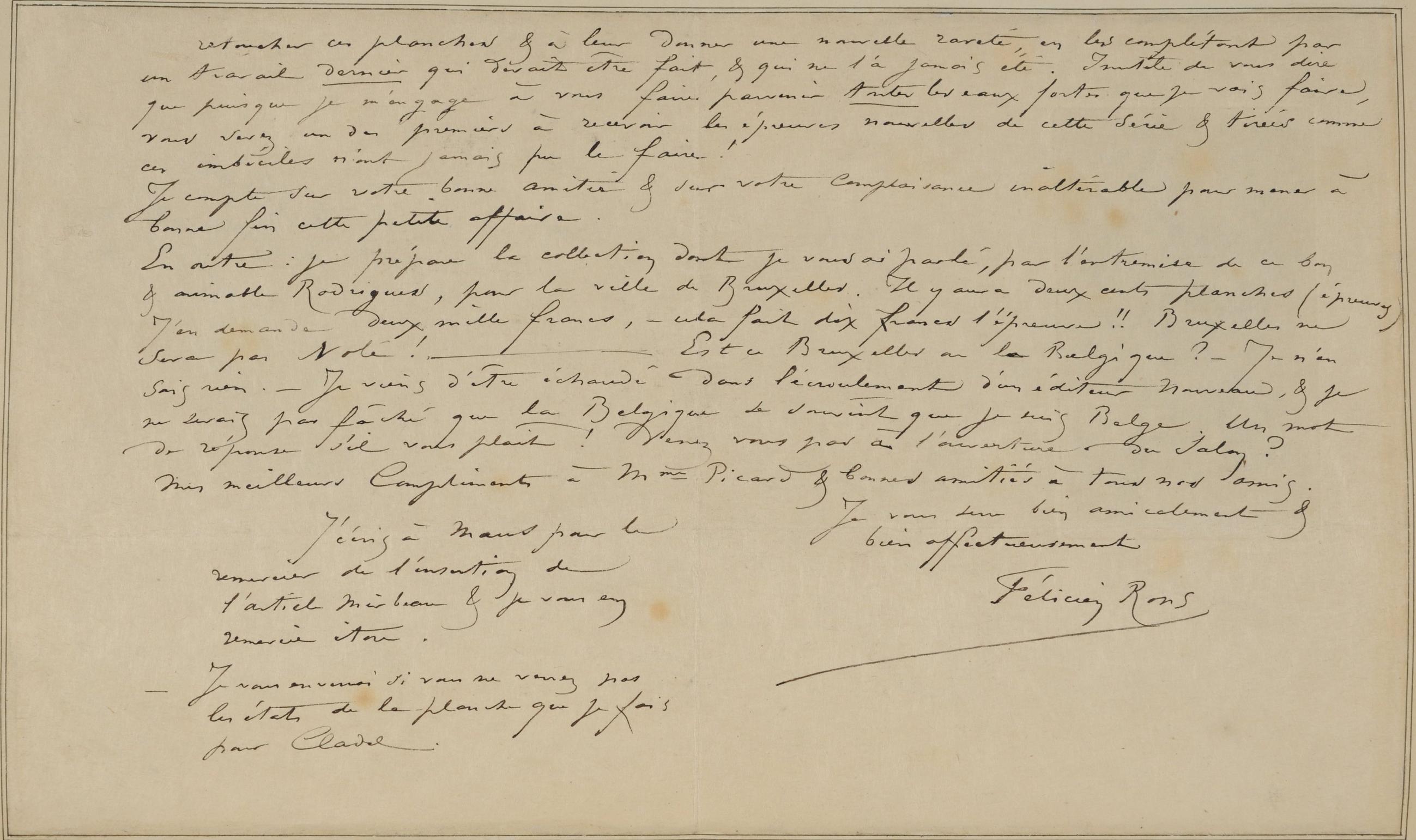 En outre : je prépare la collection dont je vous ai parlé, par l’entremise de ce bon & aimable Rodrigues, pour la ville de Bruxelles. Il y aura deux cents planches (épreuves) J’en demande deux mille francs, – cela fait dix francs l’épreuve !! Bruxelles ne sera pas volé ! – Est ce Bruxelles ou la Belgique ? – Je n’en sais rien. – Je viens d’être échaudé dans l écroulement d’un éditeur nouveau, & je ne serais pas fâché que la Belgique se souvînt que je suis Belge. Un mot de réponse s’il vous plaît ! Venez vous pas à l’ouverture du Salon ?