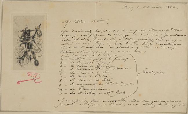 retoucher ces planches & à leur donner une nouvelle rareté, en les complétant par un travail dernier qui devait être fait, & qui ne l’a jamais été. Inutile de vous dire que puisque je m’engage à vous faire parvenir toutes les eaux fortes que je vais faire, vous serez un des premiers à recevoir les épreuves nouvelles de cette série & tirées comme ces imbéciles n’ont jamais pu le faire !