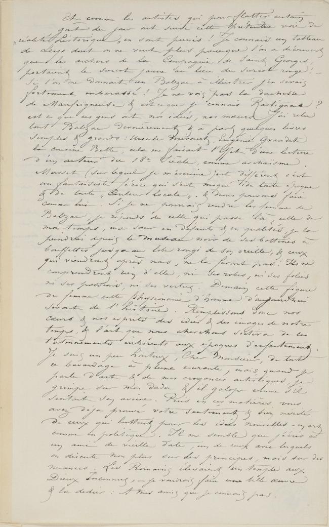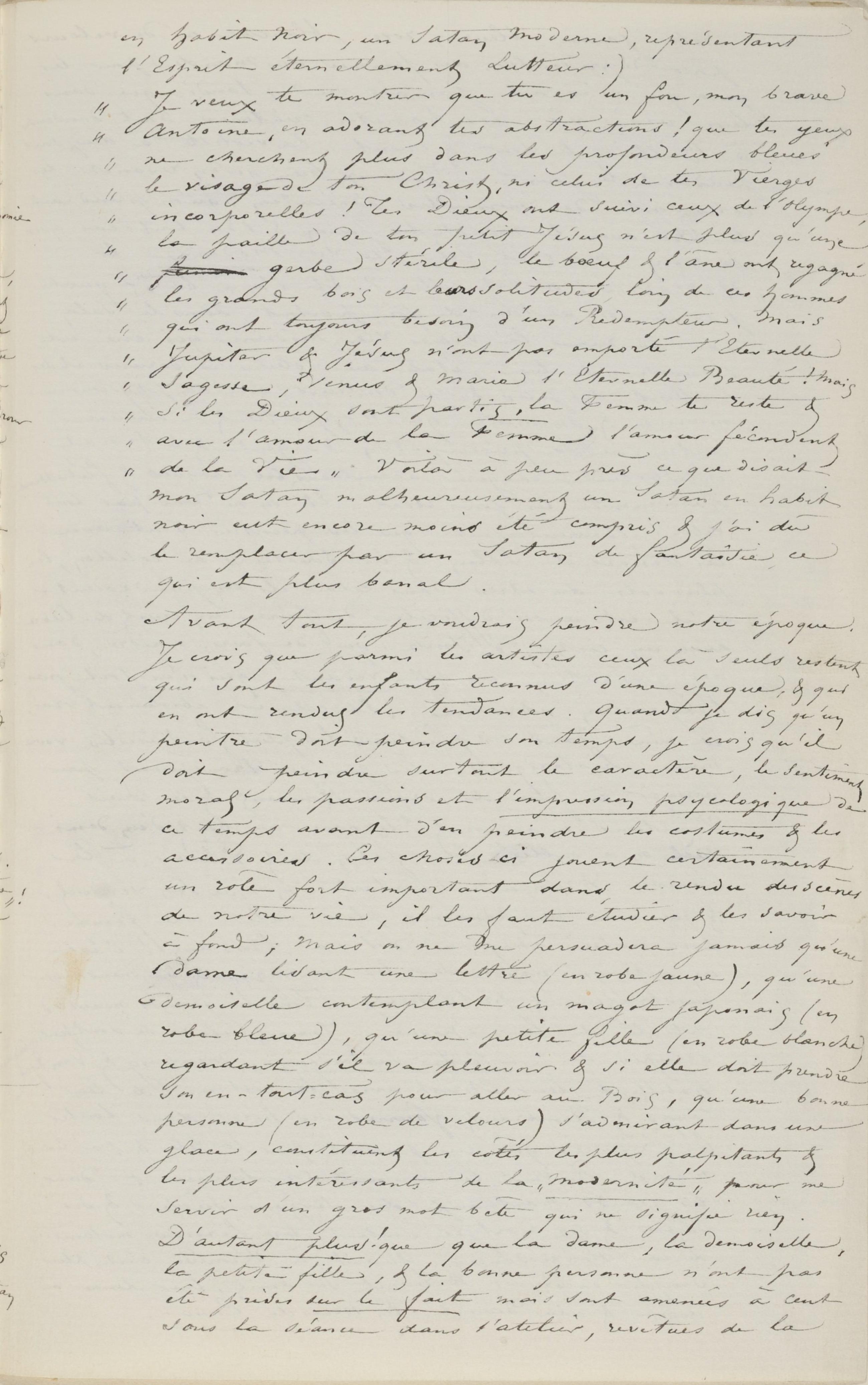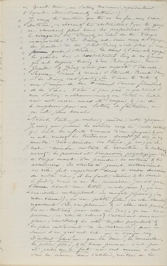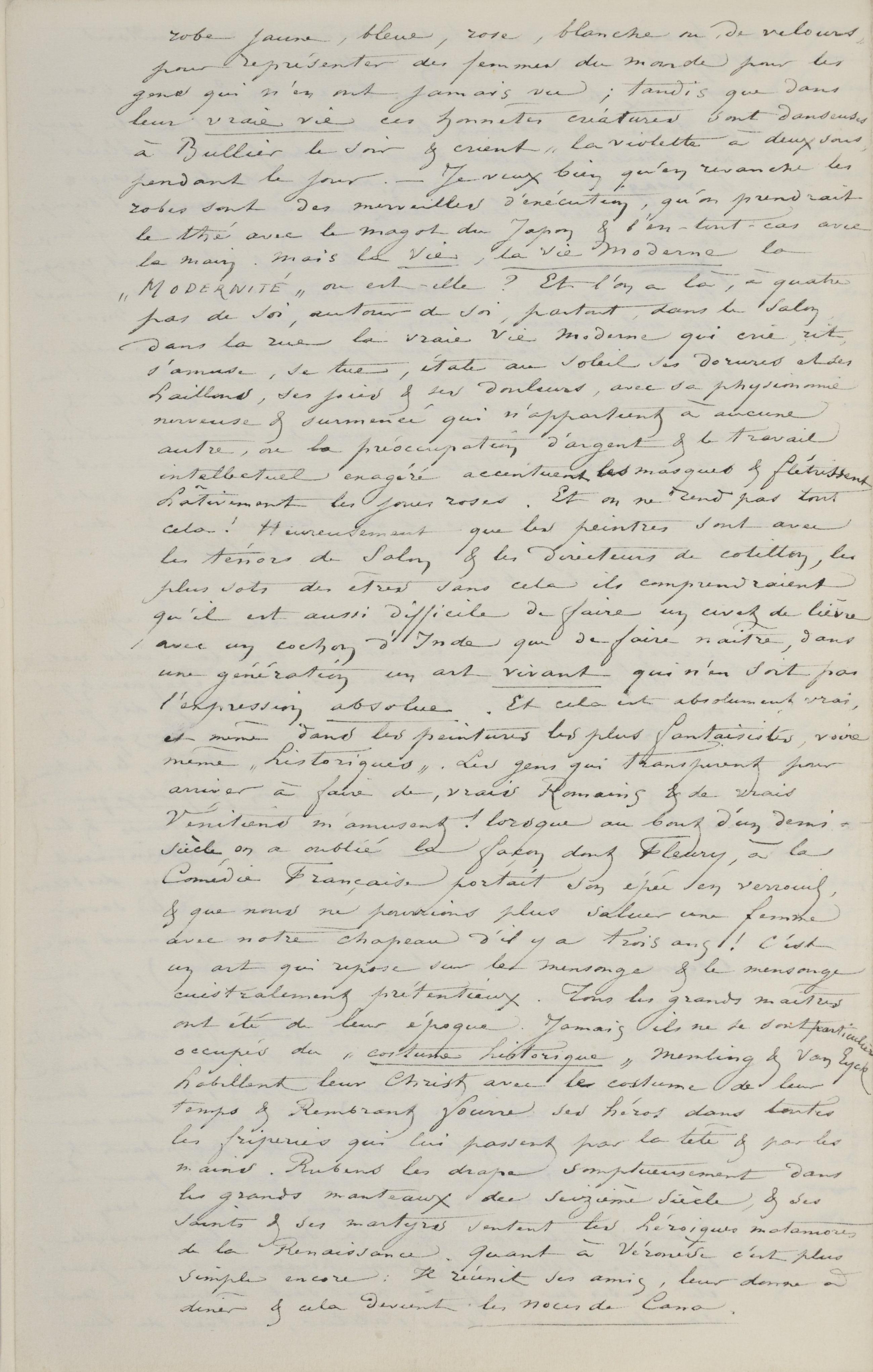Avant tout, je voudrais peindre notre époque : Je crois que parmi les artistes ceux là seuls restent qui sont les enfants reconnus d’une époque, & qui en ont rendus les tendances. Quand je dis qu’un peintre doit peindre son temps, je crois qu’il doit peindre surtout le caractère, le sentiment moral, les passions et l’impression psycologique de ce temps avant d’en peindre les costumes & les accessoires. Ces choses-ci jouent certainement un rôle fort important dans le rendu des scènes de notre vie, il les faut étudier & les savoir à fond ; mais on ne me persuadera jamais qu’une dame lisant une lettre (en robe jaune), qu’une demoiselle contemplant un magot japonais (en robe bleue), qu’une petite fille (en robe blanche) regardant s’il va pleuvoir & si elle doit prendre son en-tout-cas pour aller au Bois, qu’une bonne personne (en robe de velours) s’admirant dans une glace, constituent les côtés les plus palpitants & les plus intéressants de la « modernité » pour me servir d’un gros mot bête qui ne signifie rien. D’autant plus ! que la dame, la demoiselle, la petite fille, & la bonne personne n’ont pas été prises sur le fait mais sont amenées à cent sous la séance dans l’atelier, revêtues de la
