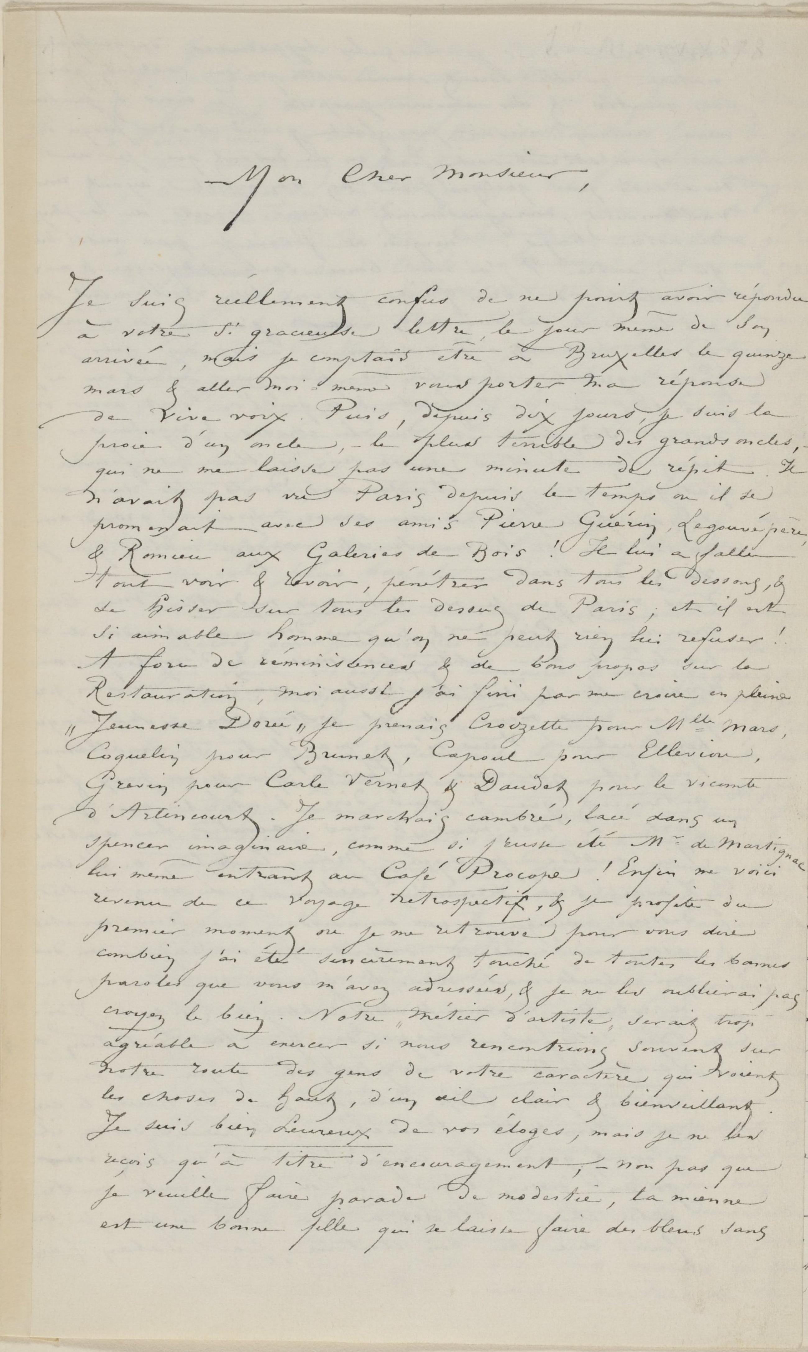 Je suis réellement confus de ne point avoir répondu à votre si gracieuse lettre, le jour même de son arrivée, mais je comptais être à Bruxelles le quinze mars & aller moi-même vous porter ma réponse de vive voix. Puis, depuis dix jours, je suis la proie d’un oncle, – le plus terrible des grands oncles, – qui ne me laisse pas une minute de répit. Il n’avait pas vu Paris depuis le temps où il se promenait avec ses amis Pierre Guérin, Legouvé père, & Romieu aux Galeries de Bois ! Il lui a fallu tout voir & revoir, pénétrer dans tous les dessous, & se hisser sur tous les dessus de Paris ; et il est si aimable homme qu’on ne peut rien lui refuser ! À force de réminiscences & de bons propos sur la Restauration, moi aussi j’ai fini par me croire en pleine « Jeunesse Dorée » je prenais Croizette pour Mlle Mars, Coquelin pour Brunet, Capoul pour Elleviou, Grevin pour Carle Vernet & Daudet pour le vicomte d’Arlincourt. Je marchais cambré, lacé dans un spencer imaginaire, comme si j’eusse été Mr de Martignac lui même entrant au Café Procope ! Enfin me voici revenu de ce voyage retrospectif, & je profite du premier moment où je me retrouve pour vous dire combien j’ai été sincèrement touché de toutes les bonnes paroles que vous m’avez adressées, & je ne les oublierai pas croyez le bien. Notre « métier d’artiste » serait trop agréable à exercer si nous rencontrions souvent sur notre route des gens de votre caractère qui voient les choses de haut, d’un œil clair & bienveillant. Je suis bien heureux de vos éloges, mais je ne les reçois qu’à titre d’encouragement, – non pas que je veuille faire parade de modestie, la mienne est une bonne fille qui se laisse faire des bleus sans