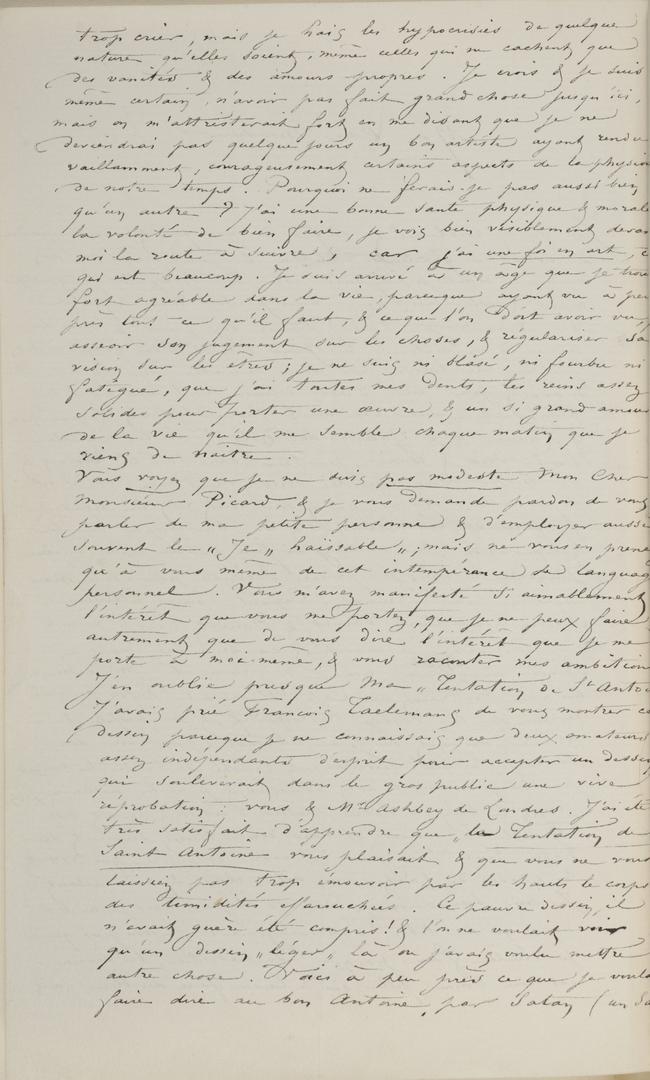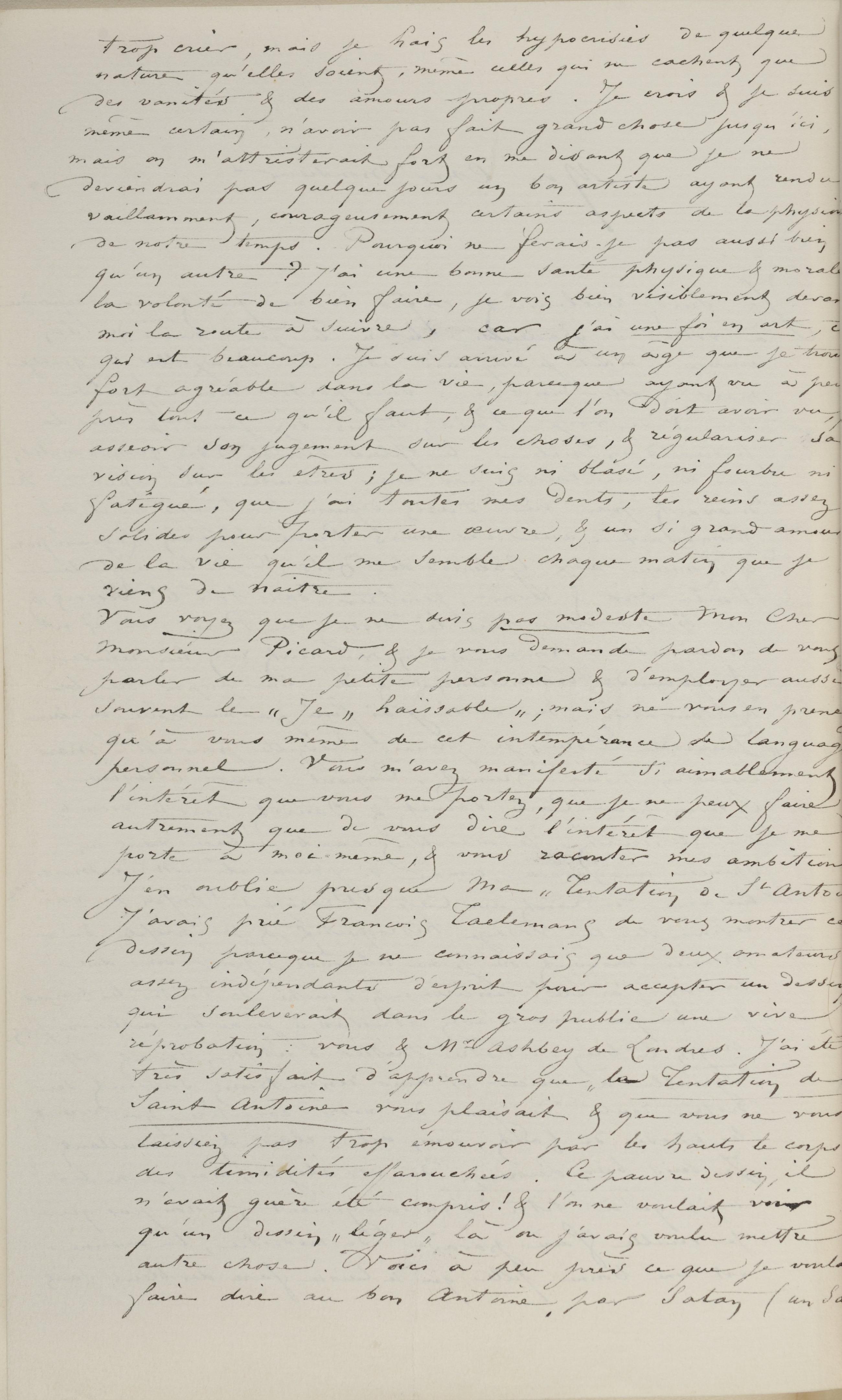 Vous voyez que je ne suis pas modeste Mon Cher Monsieur Picard, & je vous demande pardon de vous parler de ma petite personne & d’employer aussi souvent le « Je » haïssable » ; mais ne vous en prenez qu’à vous même de cet intempérance de language personnel. Vous m’avez manifesté si aimablement l’intérêt que vous me portez, que je ne peux faire autrement que de vous dire l’intérêt que je me porte à moi-même, & vous raconter mes ambitions. J’en oublie presque ma « Tentation de St Antoine » ! J’avais prié Francois Taelemans de vous montrer ce dessin parceque je ne connaissais que deux amateurs assez indépendants d’esprit pour accepter un dessin qui souleverait dans le gros public une vive réprobation : vous & Mr Ashbey de Londres. J’ai été très satisfait d’apprendre que « la Tentation de Saint Antoine vous plaisait & que vous ne vous laissiez pas trop émouvoir par les hauts le corps des timidités effarouchées. Ce pauvre dessin, il n’avait guère été compris ! & l’on ne voulait voir qu’un dessin « léger » là où j’avais voulu mettre autre chose. Voici à peu près ce que je voulais faire dire au bon Antoine, par Satan (un Satan