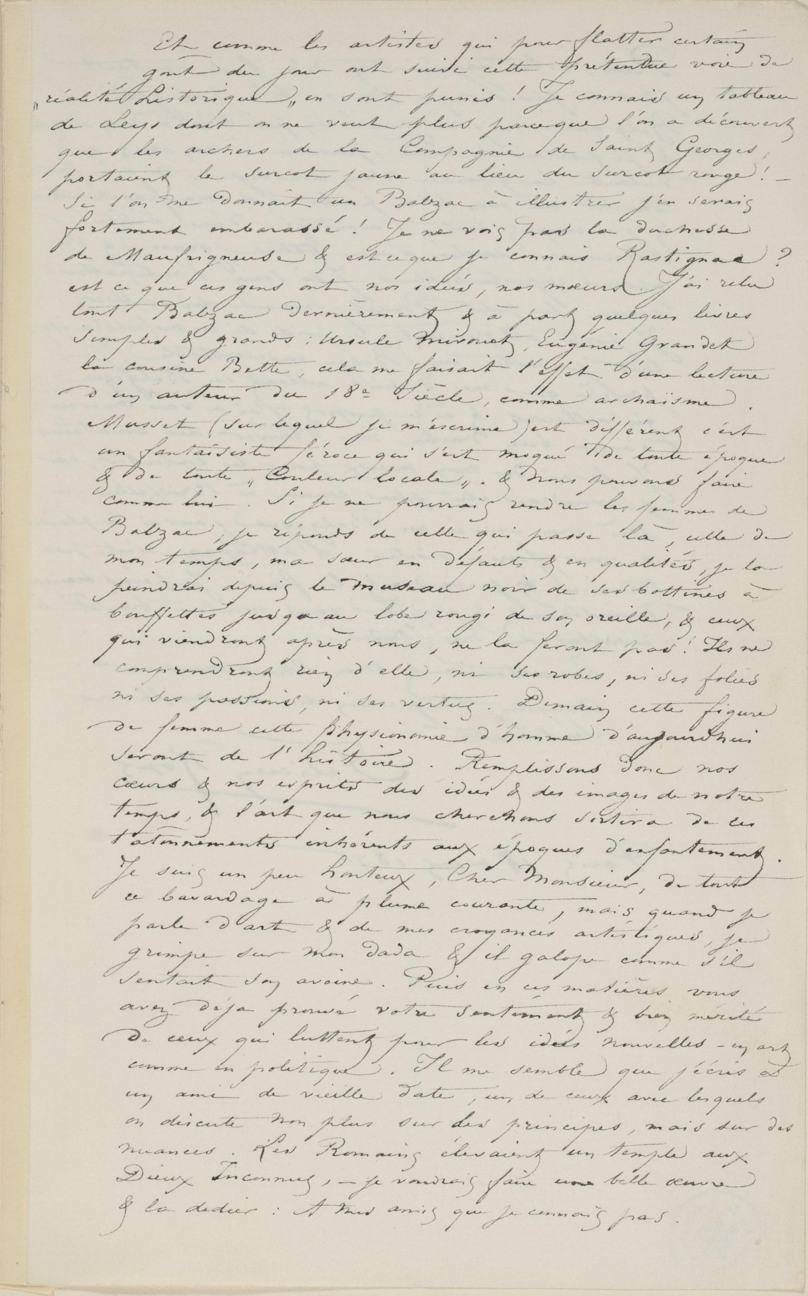 Si l’on me donnait un Balzac à illustrer j’en serais fortement embarassé ! Je ne vois pas la duchesse de Maufrigneuse & est ce que je connais Rastignac ? est ce que ces gens ont nos idées, nos mœurs. J’ai relu tout Balzac dernièrement & à part quelques livres simples & grands : Ursule Mirouet, Eugénie Grandet la cousine Bette, cela me faisait l’effet d’une lecture d’un auteur du 18e Siècle, comme archaïsme. Musset (sur lequel je m’escrime) est différent c’est un fantaisiste féroce qui s’est moqué de toute époque & de toute « Couleur locale ». & Nous pouvons faire comme lui. Si je ne pourrais rendre les femmes de Balzac, je réponds de celle qui passe là, celle de mon temps, ma sœur en défauts & en qualités, je la peindrai depuis le Museau noir de ses bottines à bouffettes jusqu au lobe rougi de son oreille, & ceux qui viendront après nous, ne la feront pas ! Ils ne comprendront rien d’elle, ni ses robes, ni ses folies ni ses passions, ni ses vertus. Demain cette figure de femme cette physionomie d’homme d’aujourd’hui seront de l’histoire. Remplissons donc nos cœurs & nos esprits des idées & des images de notre temps, & l’art que nous cherchons sortira de ces tâtonnements inhérents aux époques d’enfantement. Je suis un peu honteux, Cher Monsieur, de tout ce bavardage à plume courante, mais quand je parle d’art & de mes croyances artistiques, je grimpe sur mon dada & il galope comme s’il sentait son avoine. Puis en ces matières vous avez déja prouvé votre sentiment & bien mérité de ceux qui luttent pour les idées nouvelles – en art comme en politique. Il me semble que j’écris à un ami de vieille date, un de ceux avec lesquels on discute non plus sur les principes, mais sur des nuances. Les Romains élevaient un temple aux Dieux Inconnus, – je voudrais faire une belle œuvre & la dédier : À mes amis que je connais pas.