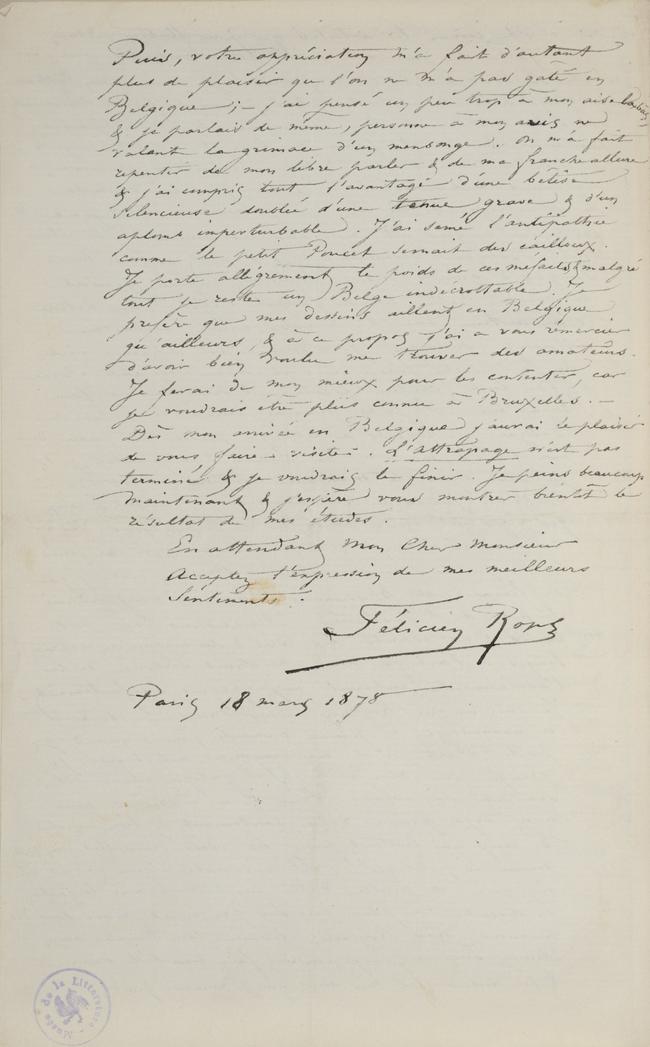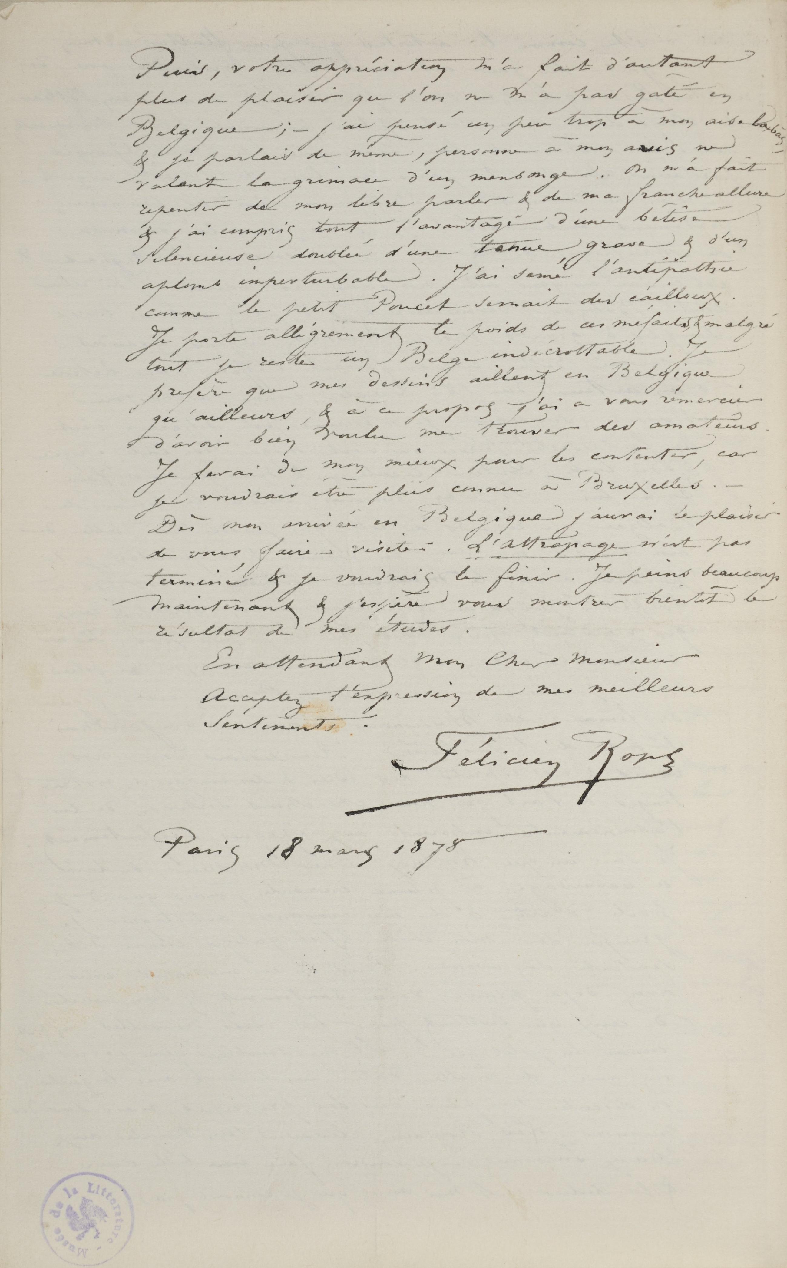 Le quatrième paragraphes de cette missive sera reformulé au sein d'une lettre de Rops à Théo Hannon qui reste probablement l'une des plus illustres de l'auteur qui porte le titre "Notes pour servir à l’histoire artistique de notre temps". Voir : inv. ML/00026/0188. – N° d’édition : 2068.