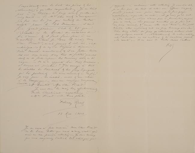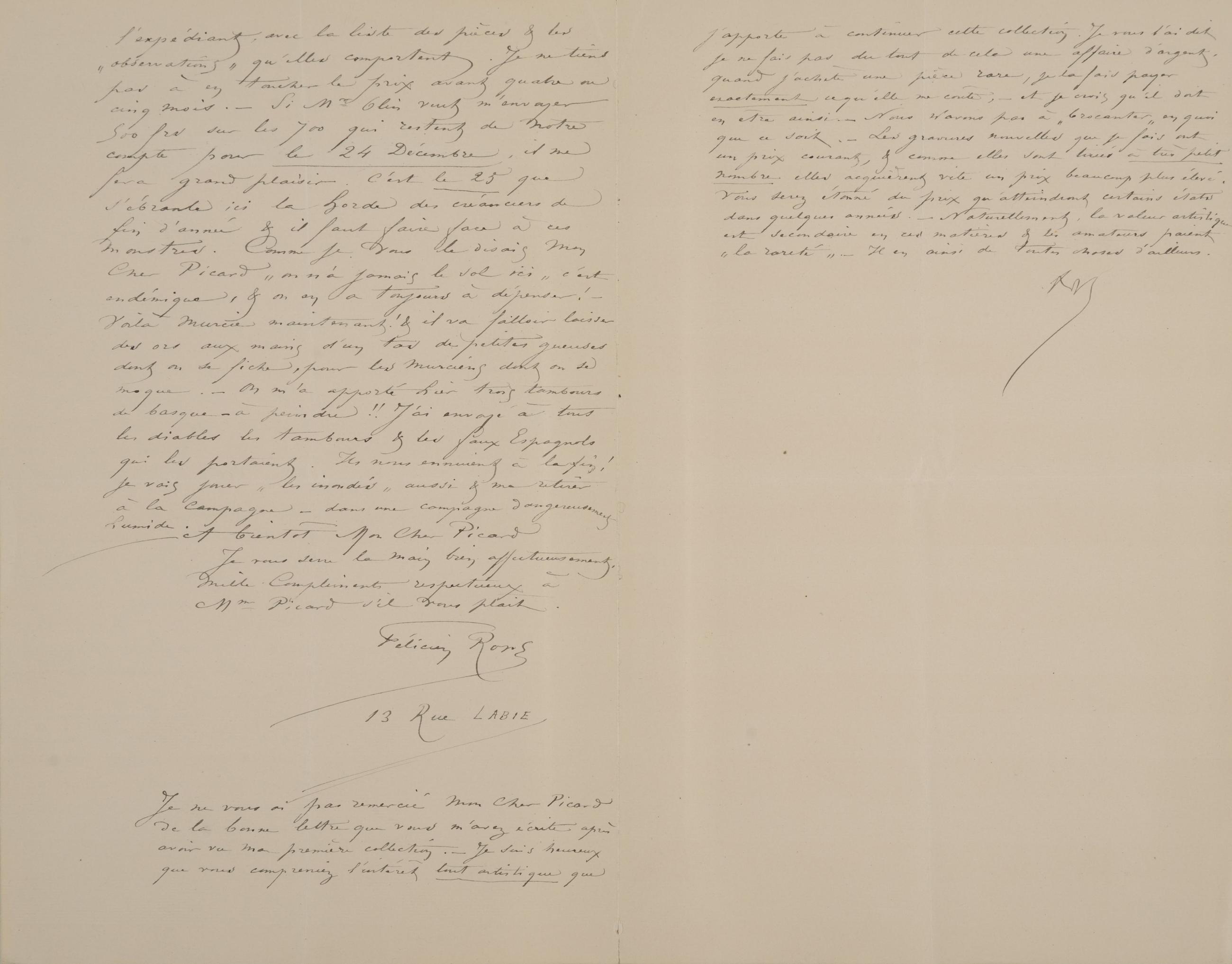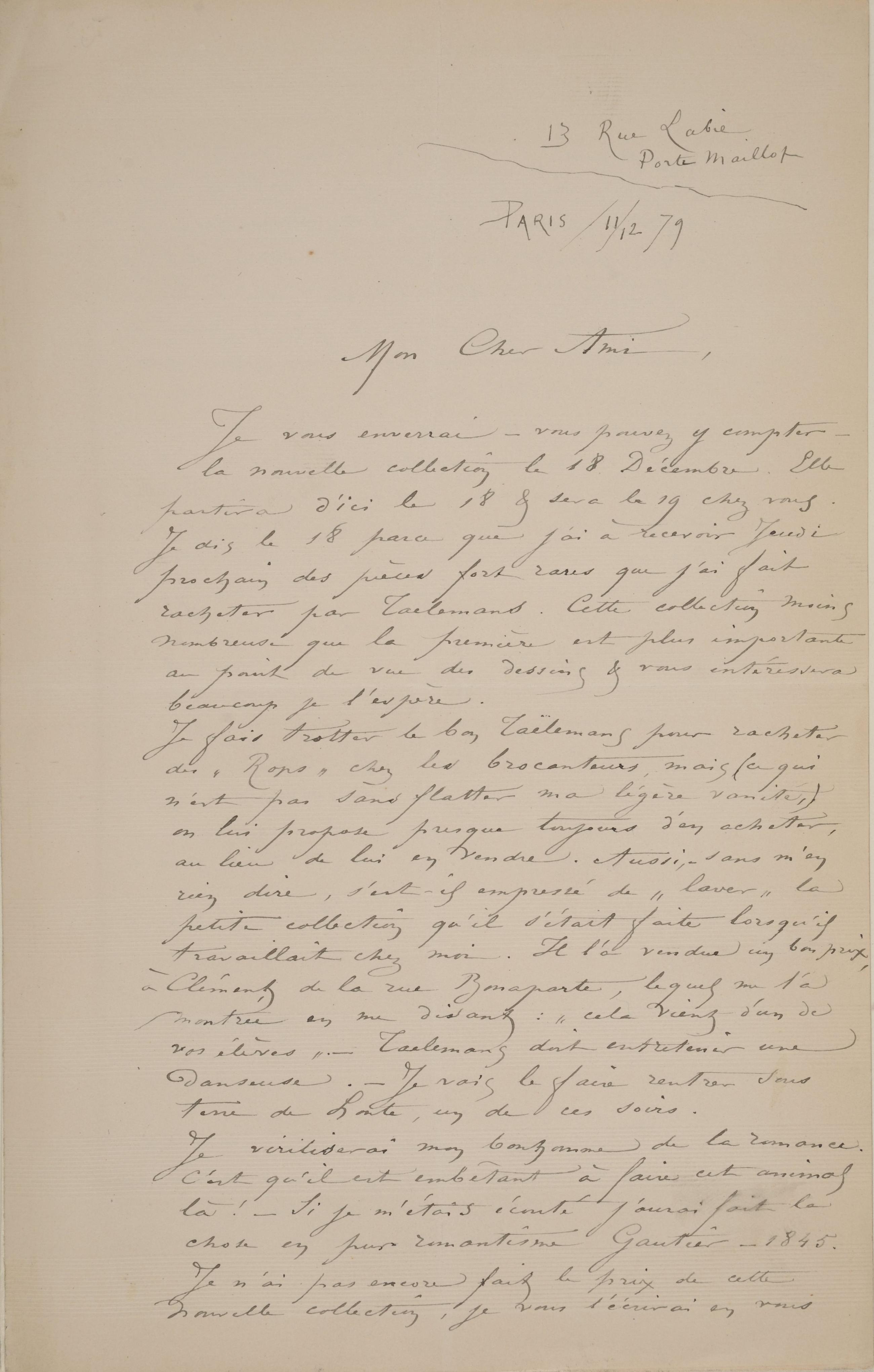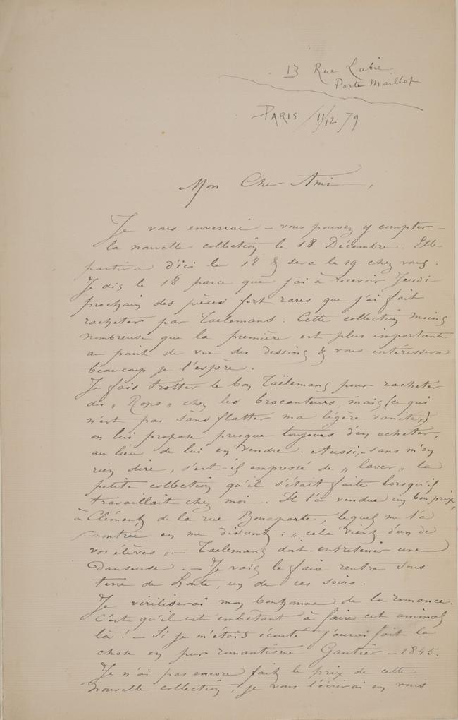 Je vous enverrai – vous pouvez y compter – la nouvelle collection le 18 Décembre. Elle partira d’ici le 18 & sera le 19 chez vous. Je dis le 18 parce que j’ai à recevoir Jeudi prochain des pièces fort rares que j’ai fait racheter par Taelemans. Cette collection moins nombreuse que la première est plus importante au point de vue des dessins & vous intéressera beaucoup je l’espère.