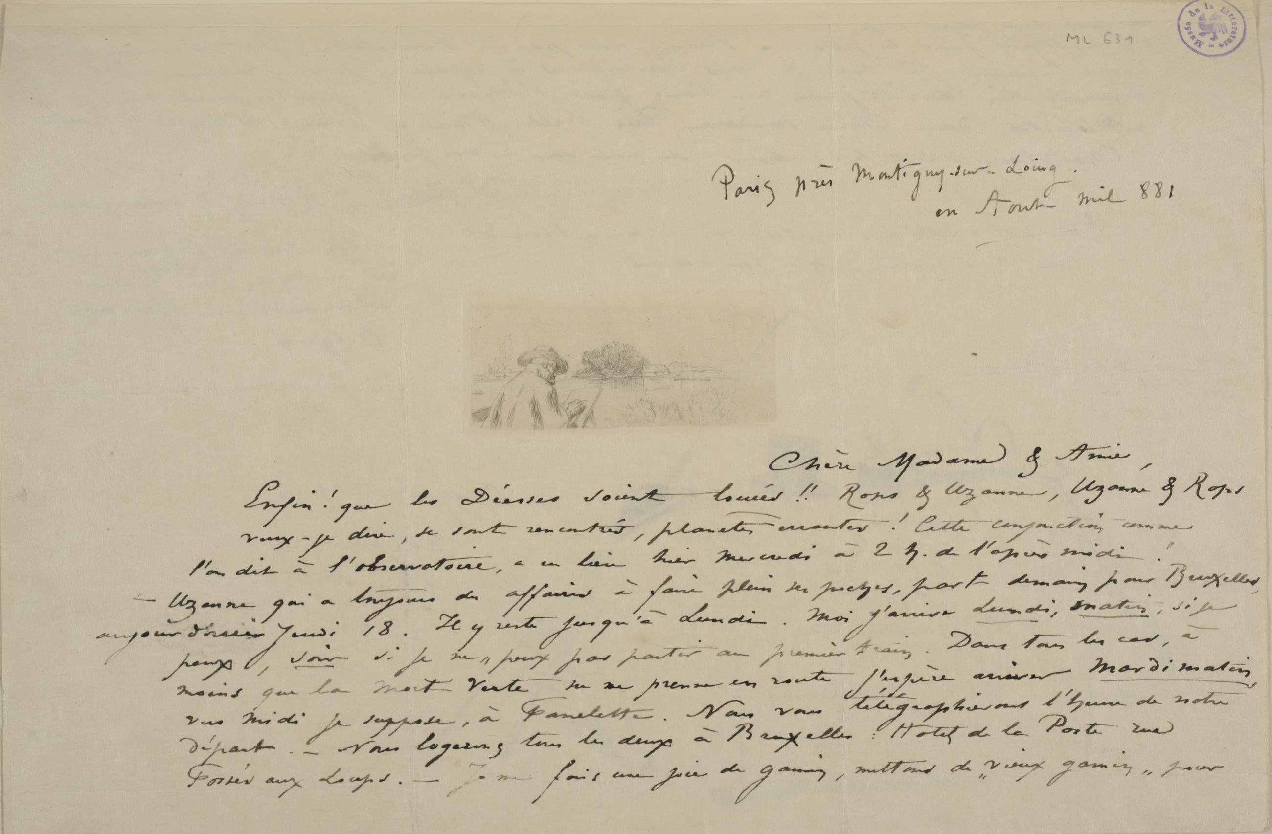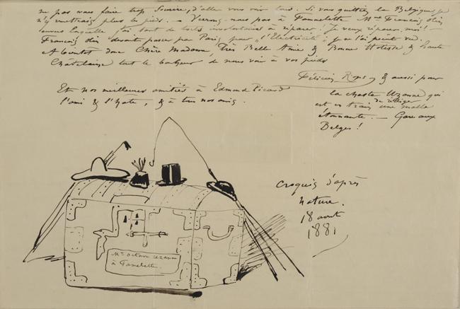 – Uzanne qui a toujours des affaires à faire plein ses poches, part demain pour Bruxelles, aujourdhui Jeudi 18. Il y reste jusqu’à Lundi. Moi j’arrive Lundi, matin, si je peux, soir si je ne « peux pas partir au premier train. Dans tous les cas, à moins que la mort verte ne me prenne en route j’espère arriver Mardi matin, vers midi je suppose, à Famelette. Nous vous télégraphierons l’heure de notre départ. – Nous logerons tous les deux à Bruxelles : Hôtel de la Poste rue Fossés aux Loups. – Je me fais une joie de gamin, mettons de « vieux gamin » pour