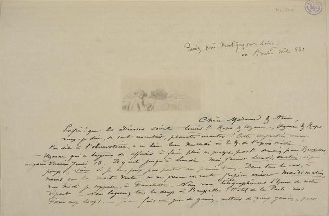 Nous datons cette lettre du 18 août 1881. En effet, Rops dit l’avoir écrite « aujourd’hui Jeudi 18 » et la lettre est datée de sa main d’août 1881. En outre, il évoque son arrivée imminente à la Famelette et nous savons par la lettre ML/00631/0074 qu’il fait le voyage de Bruxelles à Huccorgne le 26 août 1881.