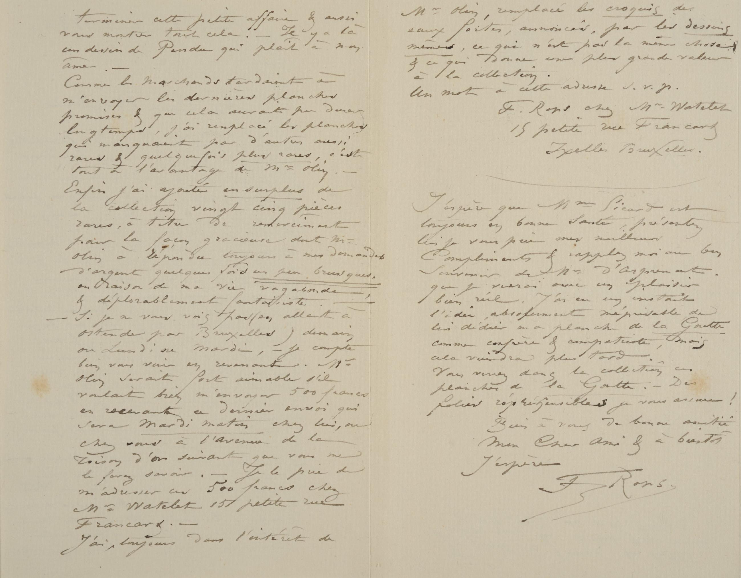 – Si je ne vous vois pas (en allant à Ostende par Bruxelles) demain ou Lundi ou Mardi, – je compte bien vous voir en revenant. Mr Olin serait fort aimable s’il voulait bien m’envoyer 500 francs en recevant ce dernier envoi qui sera Mardi matin chez lui, ou chez vous à l’Avenue de la Toison d’or suivant que vous me le ferez savoir. – Je le prie de m’adresser ces 500 francs chez Mr Watelet15 petite rue Francart. –