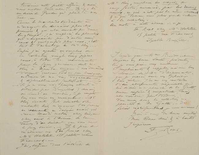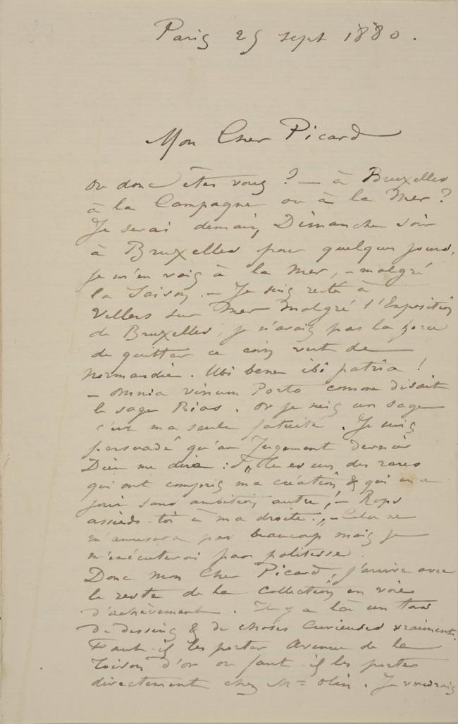 Donc Mon Cher Picard, j’arrive avec le reste de la Collection en voie d’achèvement. Il y a là un tas de dessins & de choses curieuses vraiment. Faut-il les porter Avenue de la Toison d’or ou faut-il les porter directement chez Mr Olin. Je voudrais