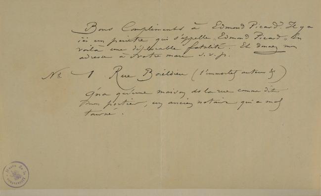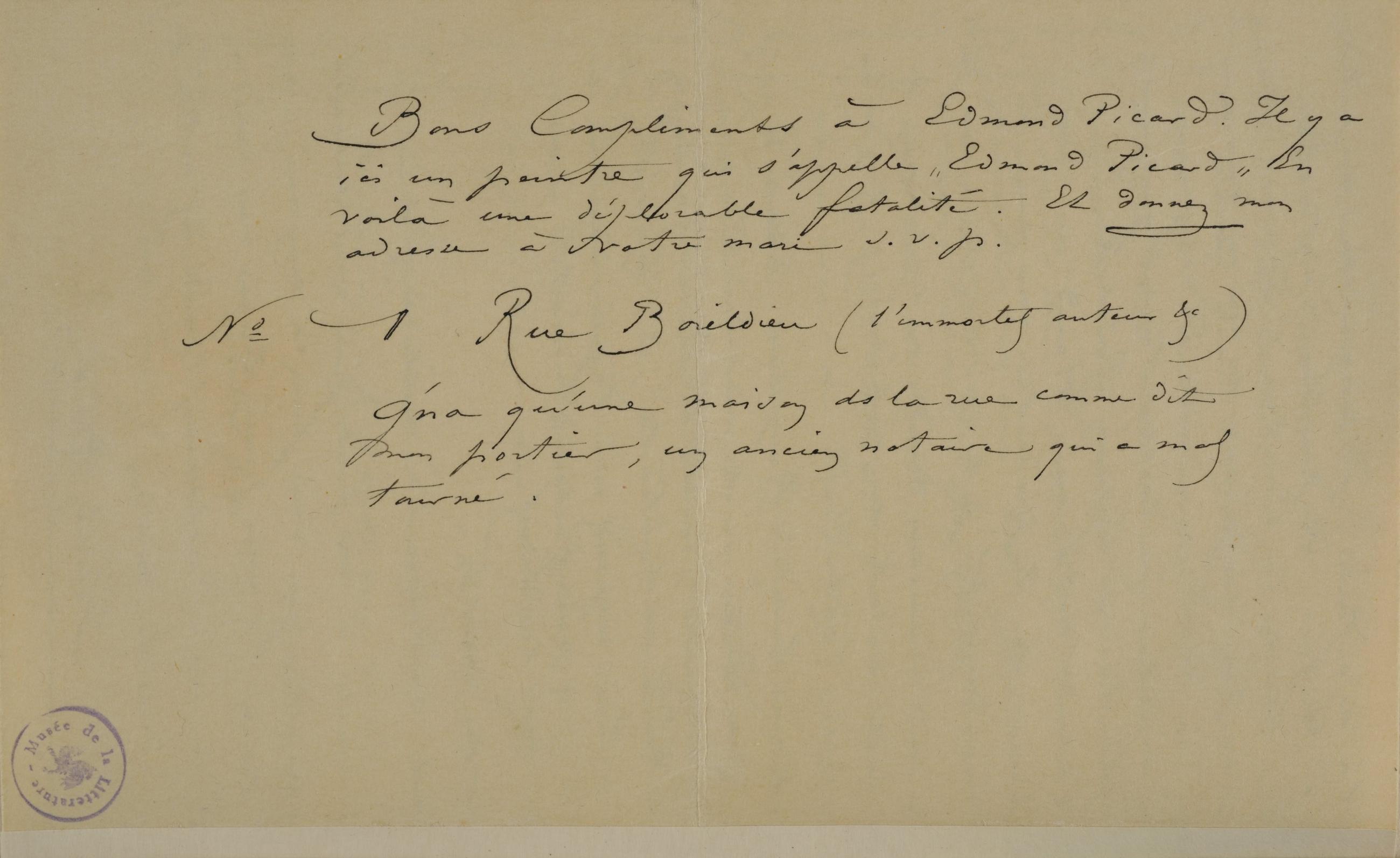 Bons Compliments à Edmond Picard. Il y a ici un peintre qui s’appelle « Edmond Picard » En voilà une déplorable fatalité. Et donnez mon adresse à votre mari s.v.p.