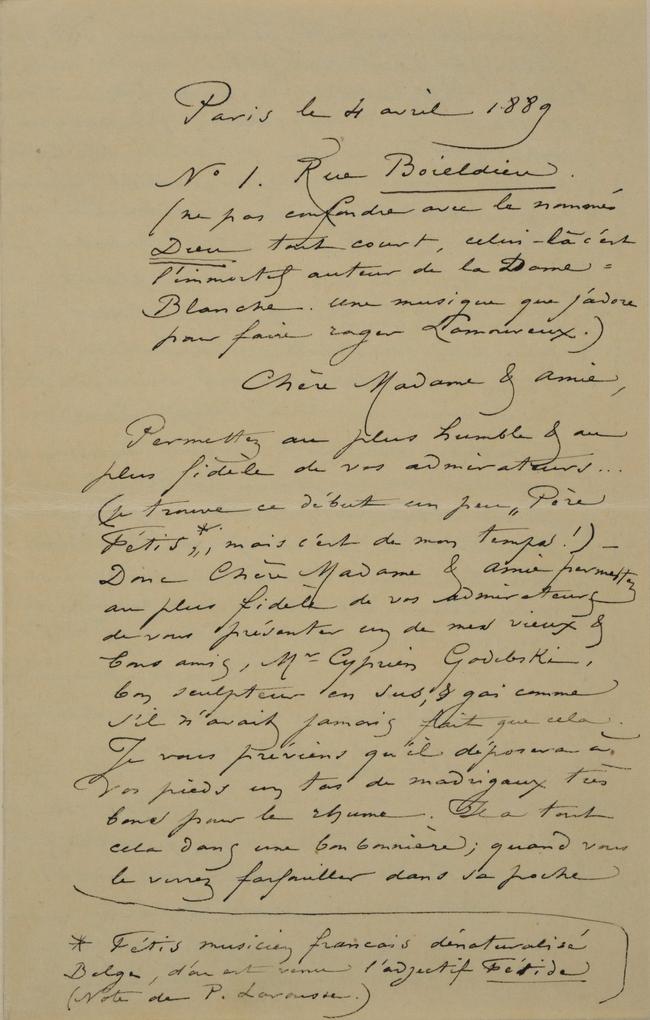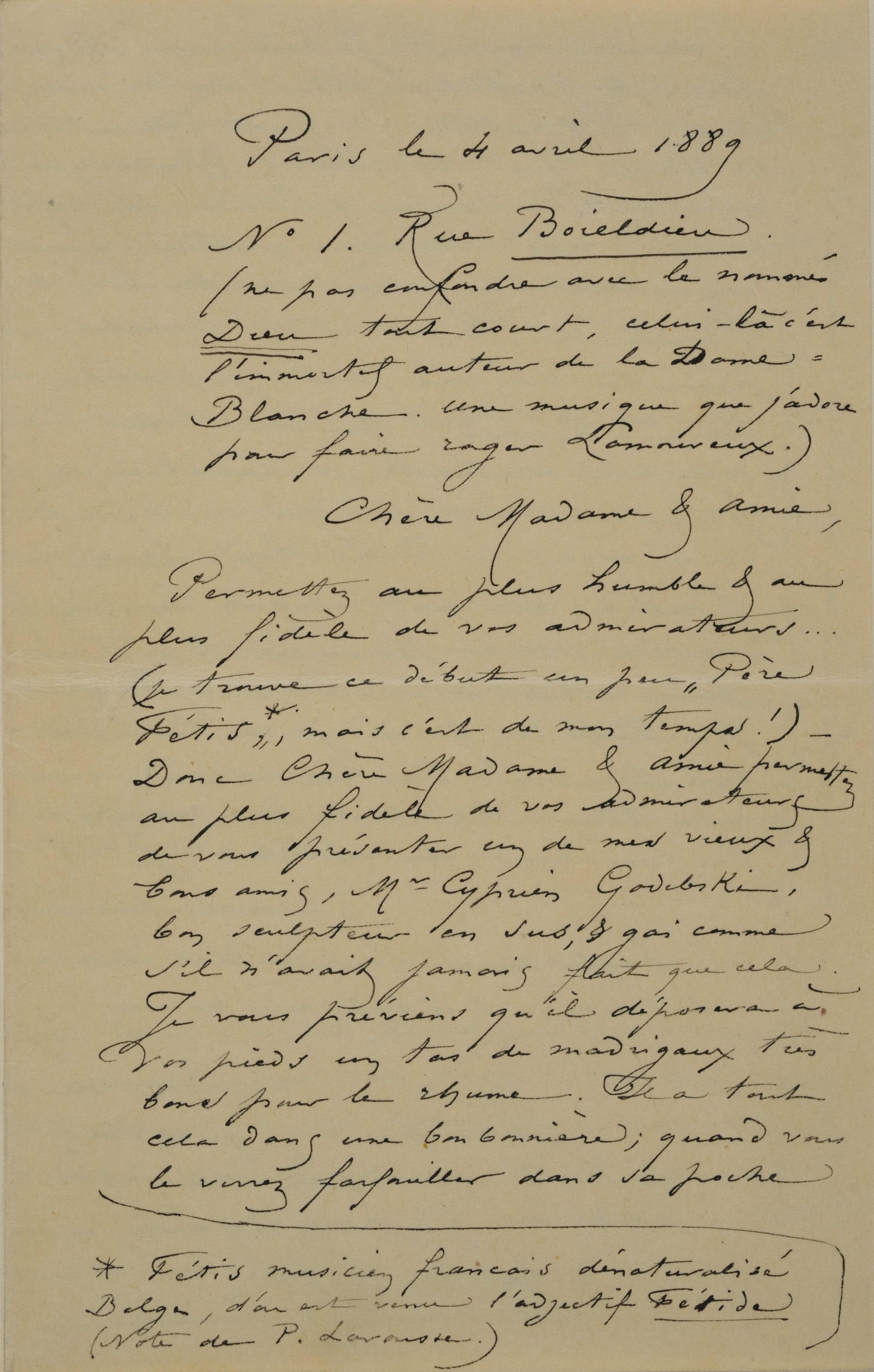 Je me remets à vos pieds pour vous remercier d’avance du bon accueil que vous ferez à mon ami, – ne dites pas non, je connais votre cœur ! & vous prier, lorsque vous viendrez à Paris, de ne pas oublier le N° 1 de la rue Boieldieu (l’immortel auteur &c) c’est au 5e mais il y a un encenseur dans la maison.