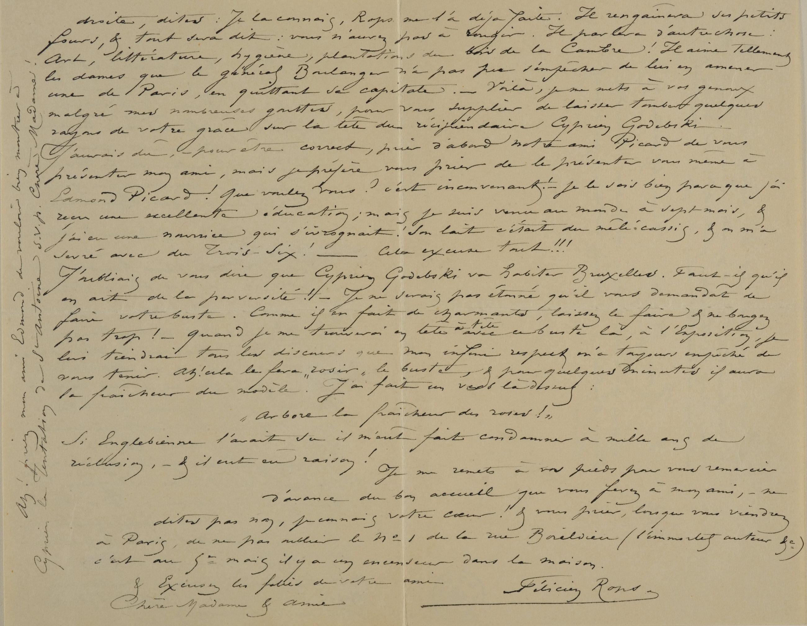 J’oubliais de vous dire que Cyprien Godebski va habiter Bruxelles. Faut-il qu’il en ait de la perversité ! – Je ne serais pas étonné qu’il vous demandât de faire votre buste. Comme il en fait de charmants, laissez le faire & ne bougez pas trop ! – Quand je me trouverai en tête à tête avec ce buste là, à l’Exposition, je lui tiendrai tous les discours que mon infini respect m’a toujours empêché de vous tenir. Ah ! cela le fera « rosir » le buste, & pour quelques minutes il aura la fraîcheur du modèle. J’ai fait un vers là dessus :