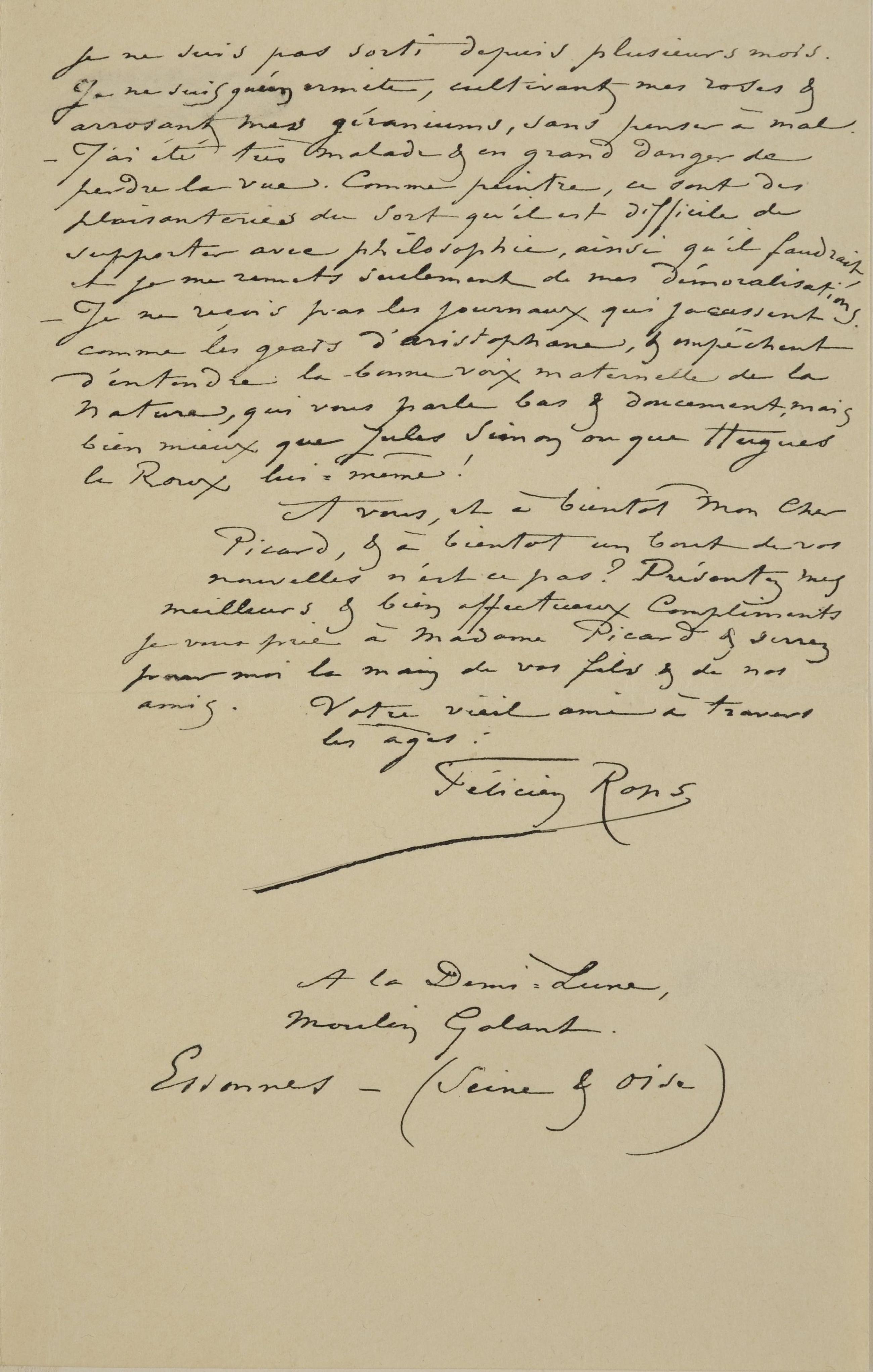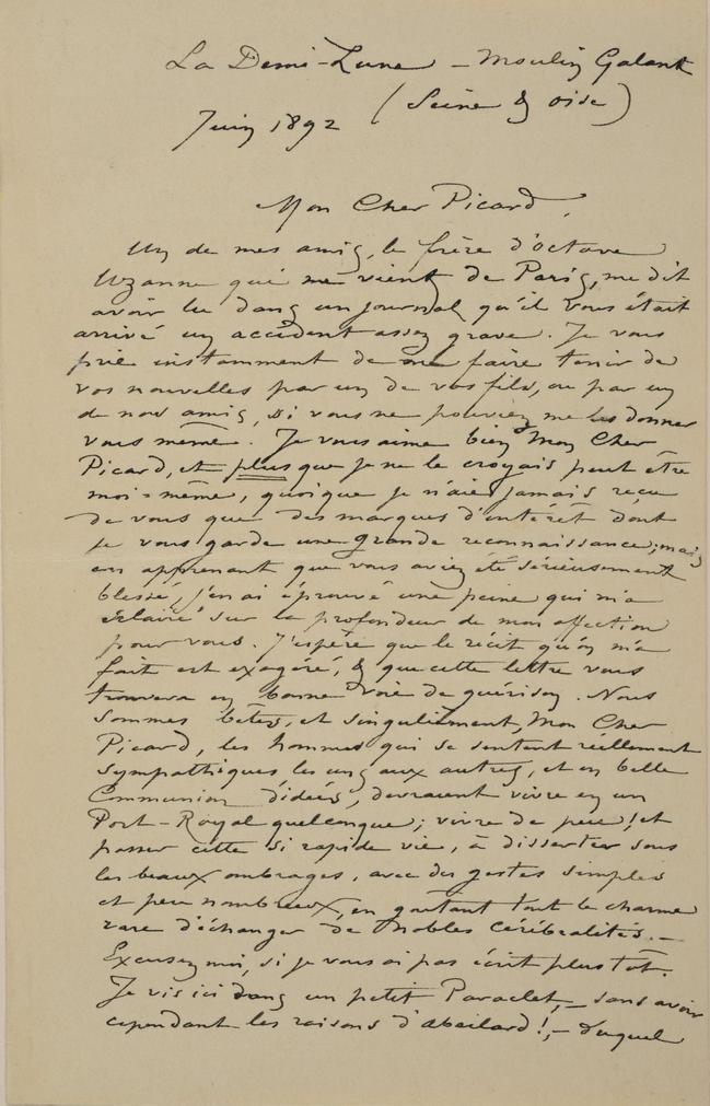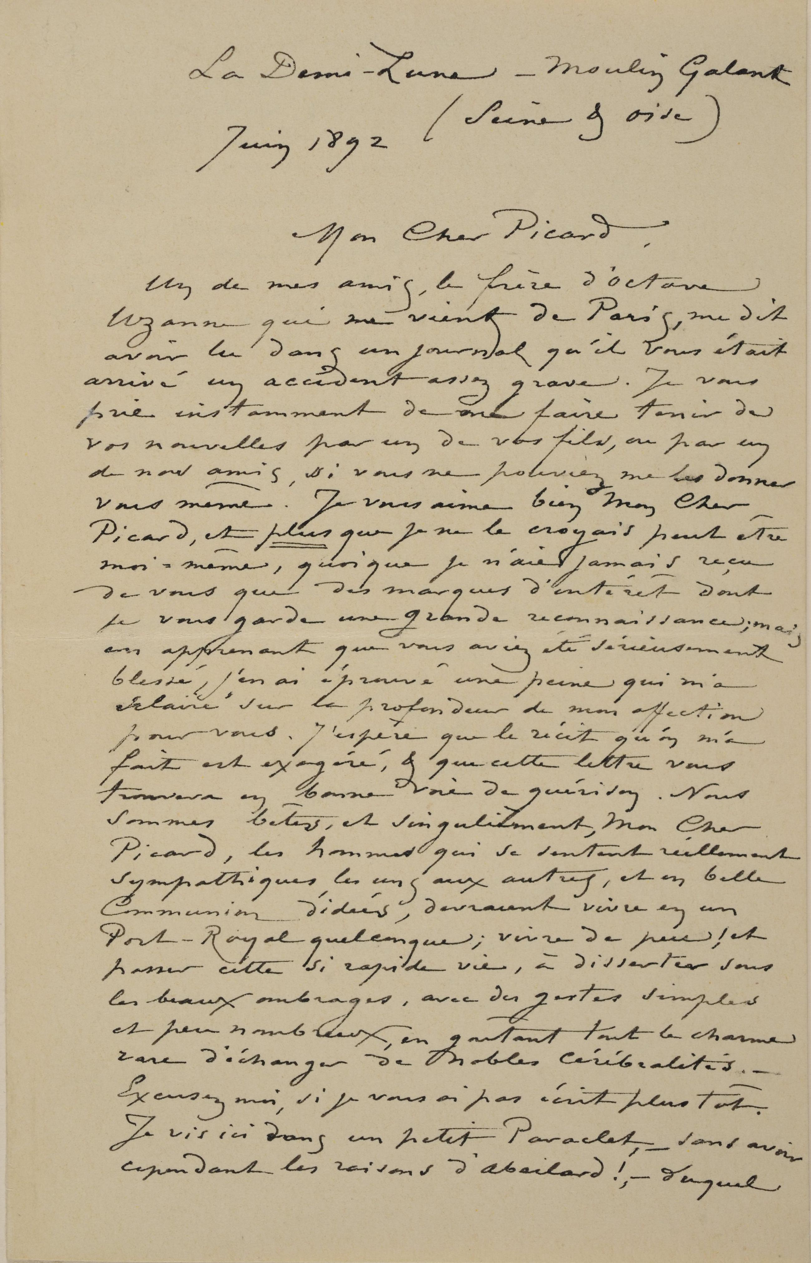 Un de mes amis, le frère d’Octave Uzanne qui me vient de Paris, me dit avoir lu dans un journal qu’il vous était arrivé un accident assez grave. Je vous prie instamment de me faire tenir de vos nouvelles par un de vos fils, ou par un de nos amis, si vous ne pouviez me les donner vous même. Je vous aime bien Mon Cher Picard, et plus que je ne le croyais peut être moi-même, quoique je n’aie jamais reçu de vous que des marques d’intérêt dont je vous garde une grande reconnaissance ; mais en apprenant que vous aviez été sérieusement blessé, j’en ai éprouvé une peine qui m’a éclairé sur la profondeur de mon affection pour vous. J’espère que le récit qu’on m’a fait est exagéré, & que cette lettre vous trouvera en bonne voie de guérison. Nous sommes bêtes, et singulièrement, Mon Cher Picard, les hommes qui se sentent réellement sympathiques les uns aux autres, et en belle Communion d’idées, devraient vivre en un Port-Royal quelconque ; vivre de peu ! et passer cette si rapide vie, à disserter sous les beaux ombrages, avec des gestes simples et peu nombreux, en goûtant tout le charme rare d’échanger de nobles cérébralités. – Excusez moi, si je vous ai pas écrit plus tôt. Je vis ici dans un petit Paraclet, – sans avoir cependant les raisons d’Abeilard !, – duquel