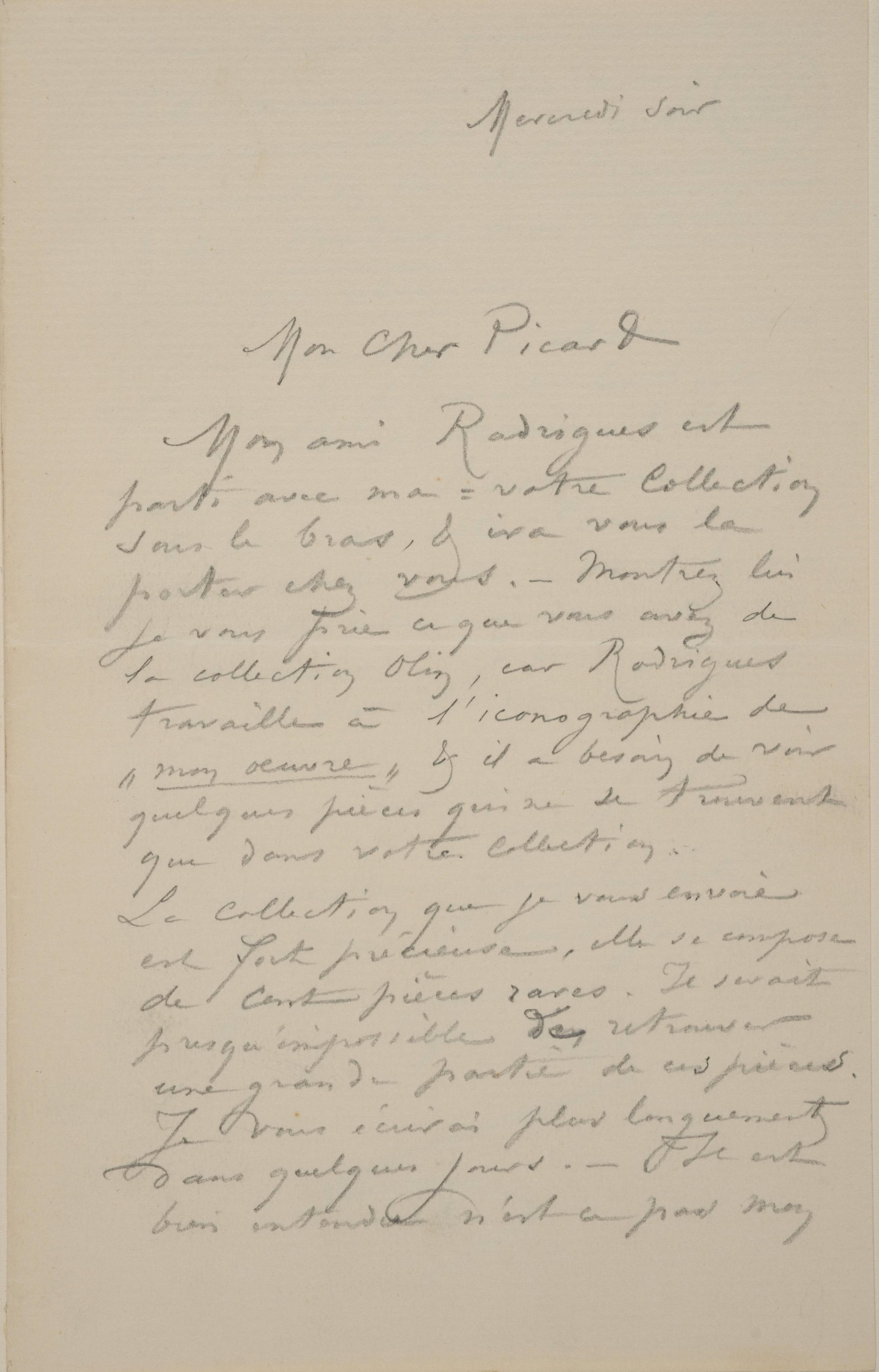 Mon ami Rodrigues est parti avec ma-votre Collection sous le bras, & ira vous la porter chez vous. – Montrez lui je vous prie ce que vous avez de la collection Olin, car Rodrigues travaille à l’iconographie de « mon œuvre » & il a besoin de voir quelques pièces qui ne se trouvent que dans votre collection.