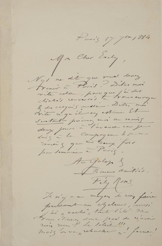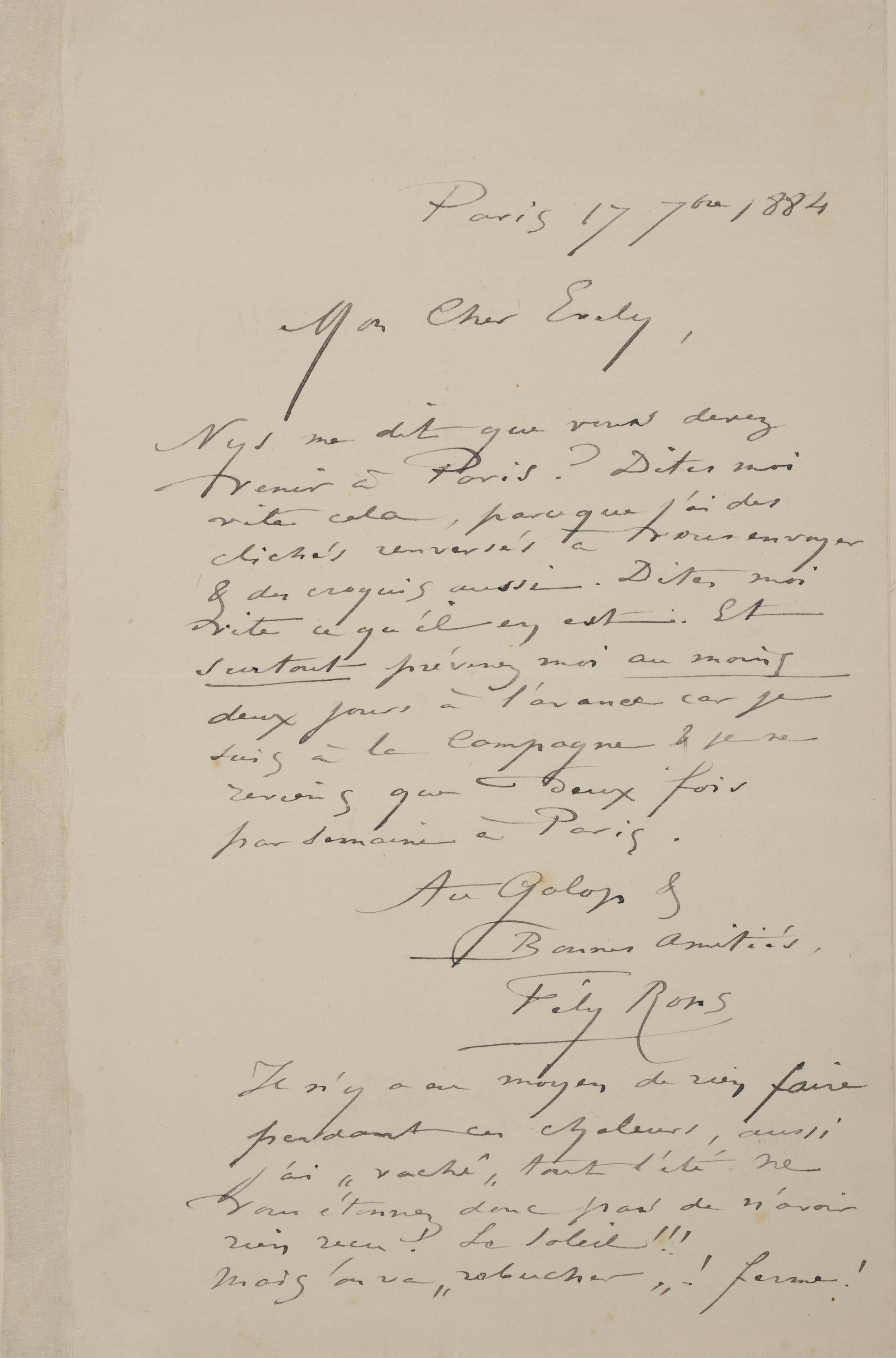 Nys me dit que vous devez venir à Paris ? Dites moi vite cela, parce que j’ai des clichés renversés à vous envoyer & des croquis aussi. Dites moi vite ce qu’il en est. Et surtout prévenez moi au moins deux jours à l’avance car je suis à la Campagne & je ne reviens que deux fois par semaine à Paris.