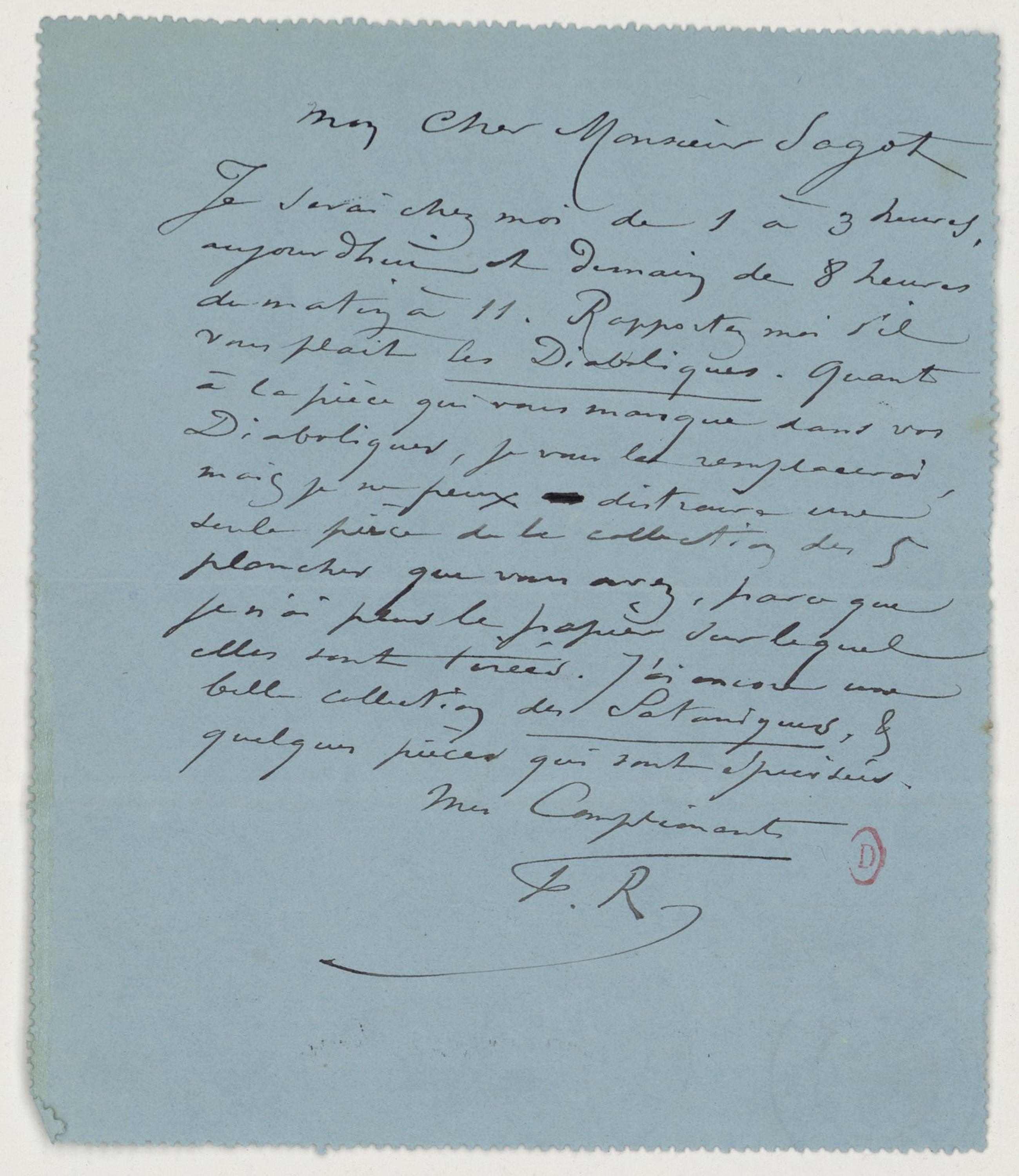 Je serai chez moi de 1 à 3 heures, aujourdhui et demain de 8 heures du matin à 11. Rapportez moi s’il vous plaît les Diaboliques. Quant à la pièce qui vous manque dans vos Diaboliques, je vous la remplacerai, mais je ne peux distraire une seule pièce de la collection des 5 planches que vous avez, parce que je n’ai plus le papier sur lequel elles sont tirées. J’ai encore une belle collection des Sataniques, & quelques pièces qui sont épuisées.