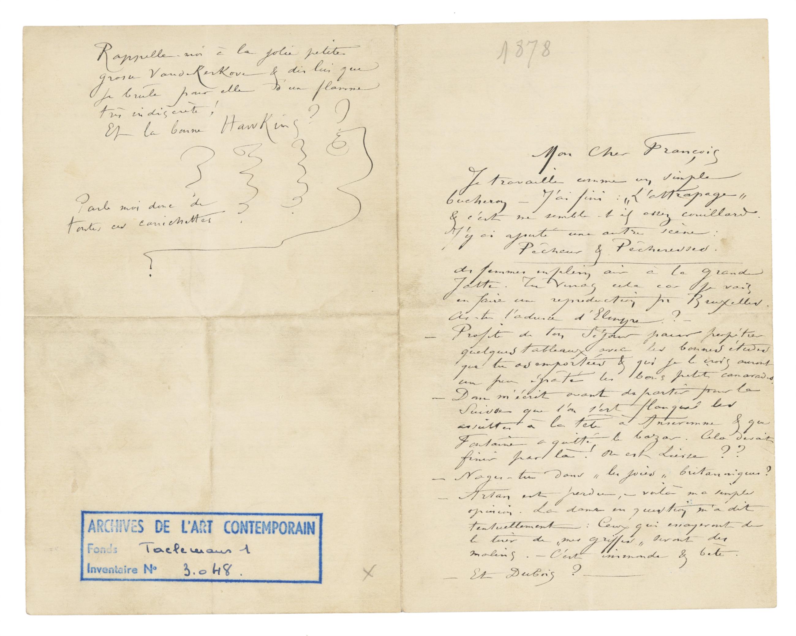 – Les chères petites amies de la rue Mosnier sont toujours aussi bonnes & aussi charmantes. Seulement Mme Duluc désirerait absolument que Mr & Mme Van de Kerkhove lui disent si oui ou non ils se décident à quelque chose dans un mois la Saison recommence & elle voudrait une réponse quelconque. Elle a l’envie de faire quelque chose & elle voudrait savoir enfin à quoi s’en tenir. Cela se comprend. Tu lui ferais un vif plaisir en te chargeant de sa demande & en la transmettant afin qu’elle puisse savoir à quoi s’en tenir à cet égard comme je viens de te le dire Je vais commencer « les femmes qui font des cartes » sous ce titre :