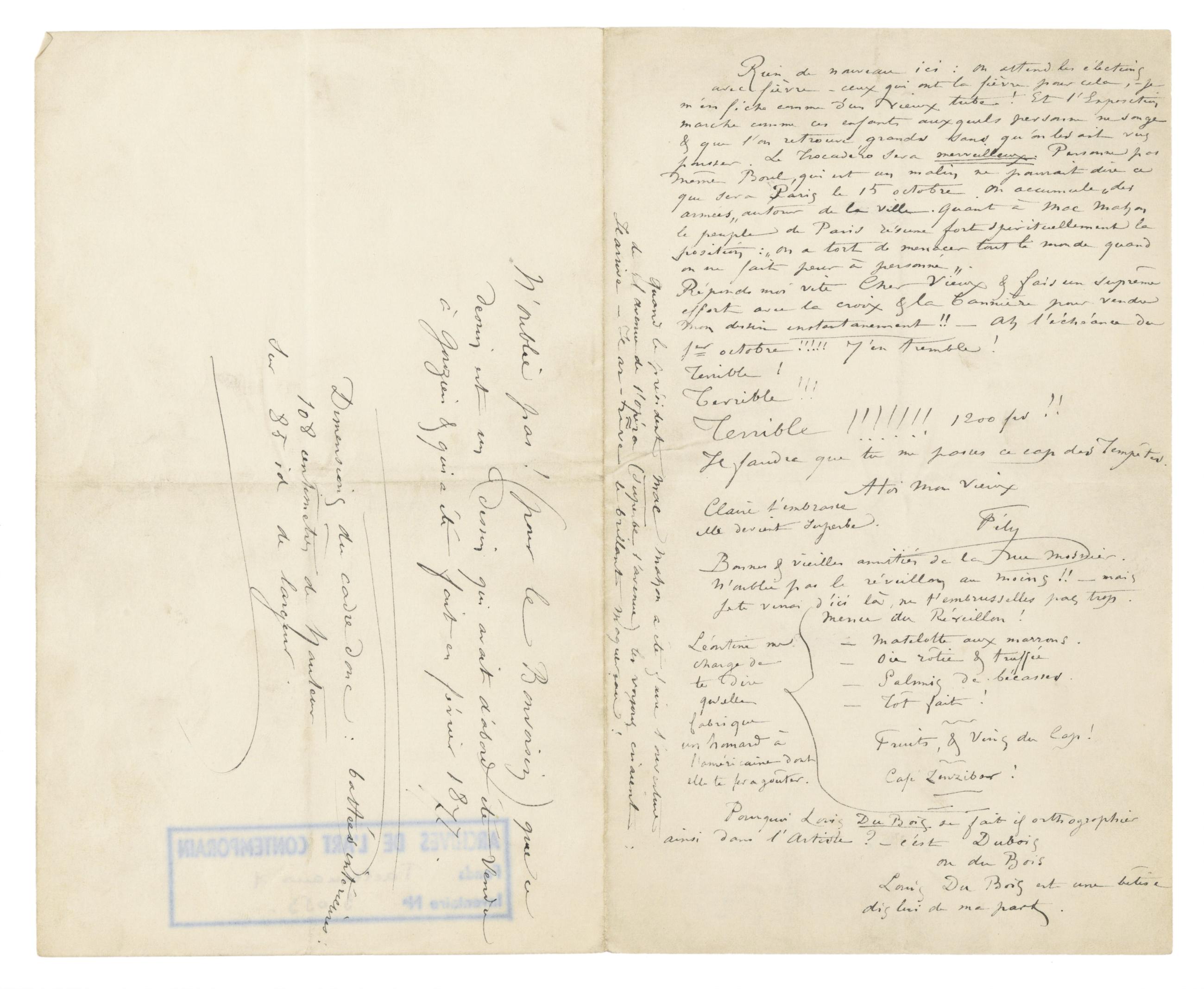 Rien de nouveau ici : on attend les élections avec fièvre – ceux qui ont la fièvre pour cela, – je m’en fiche comme d’un vieux tube ! Et l’Exposition marche comme ces enfants auxquels personne ne songe & que l’on retrouve grands sans qu’on les ait vus pousser. Le Trocadéro sera merveilleux. Personne pas même Boul, qui est un malin ne pourrait dire ce que sera Paris le 15 octobre. On accumule « des armées » autour de la ville. Quant à Mac Mahon le peuple de Paris résume fort spirituellement la position : « On a tort de menacer tout le monde quand on ne fait peur à personne ».