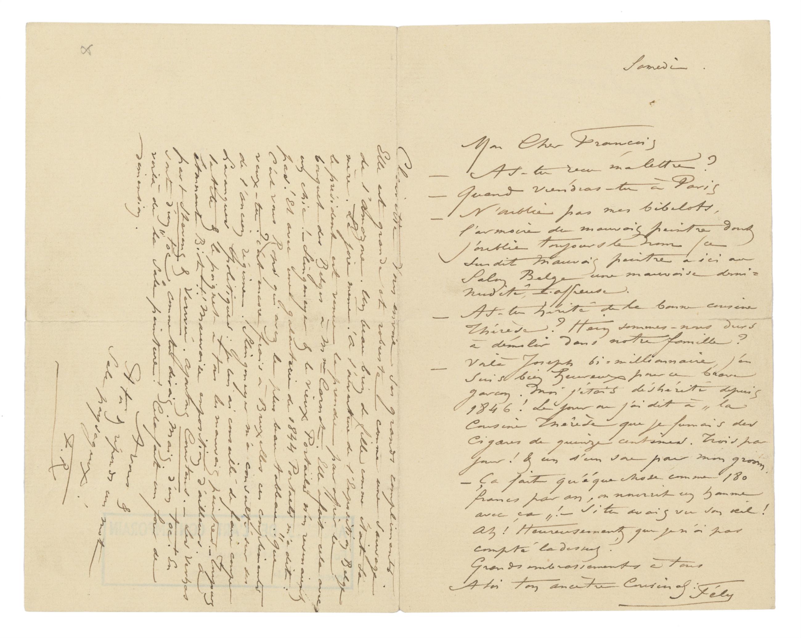 – N’oublie pas mes bibelots, l’armoire du mauvais peintre dont j’oublie toujours le nom (ce susdit mauvais peintre a ici au Salon Belge une mauvaise demi-nudité, – affreuse.