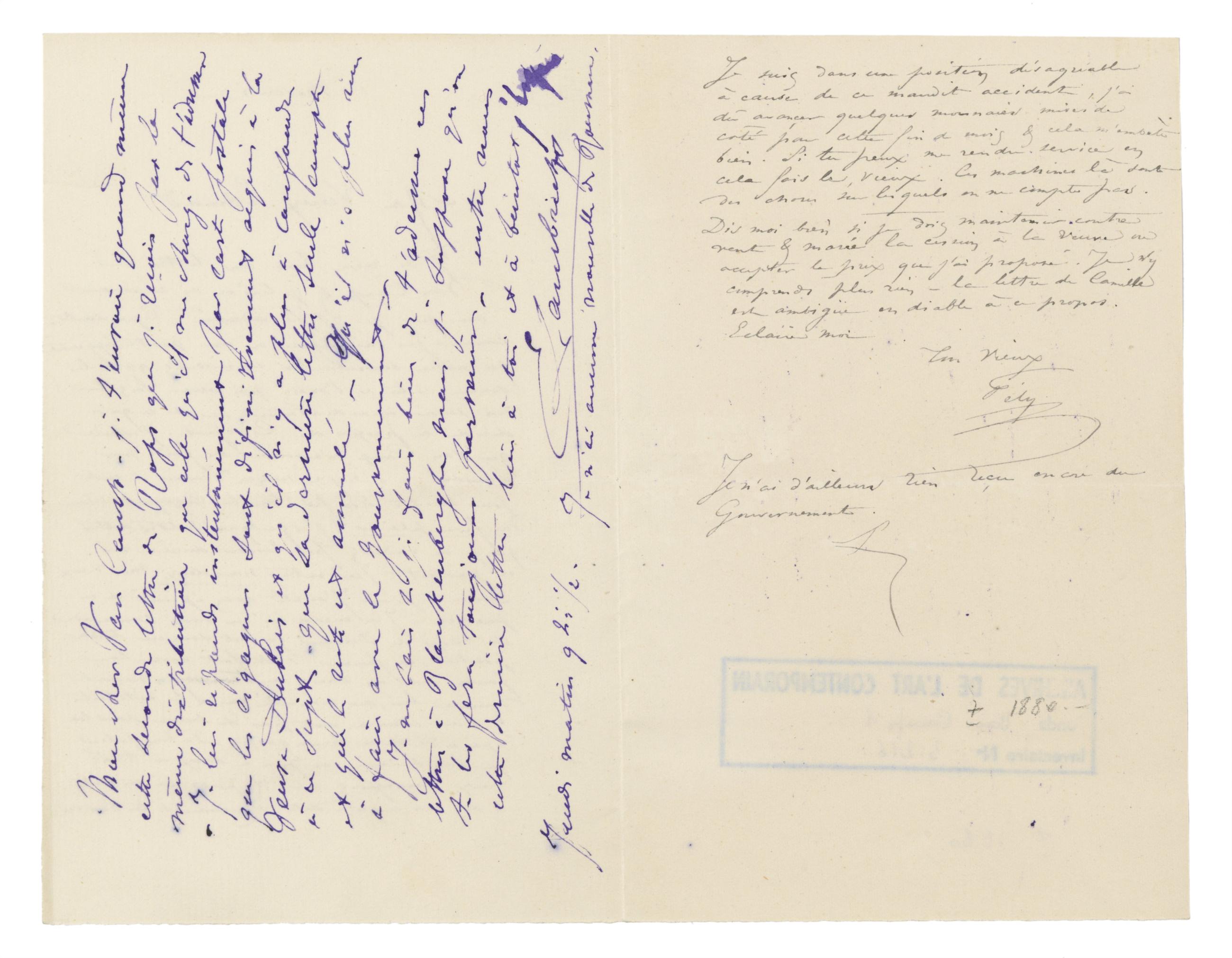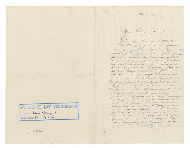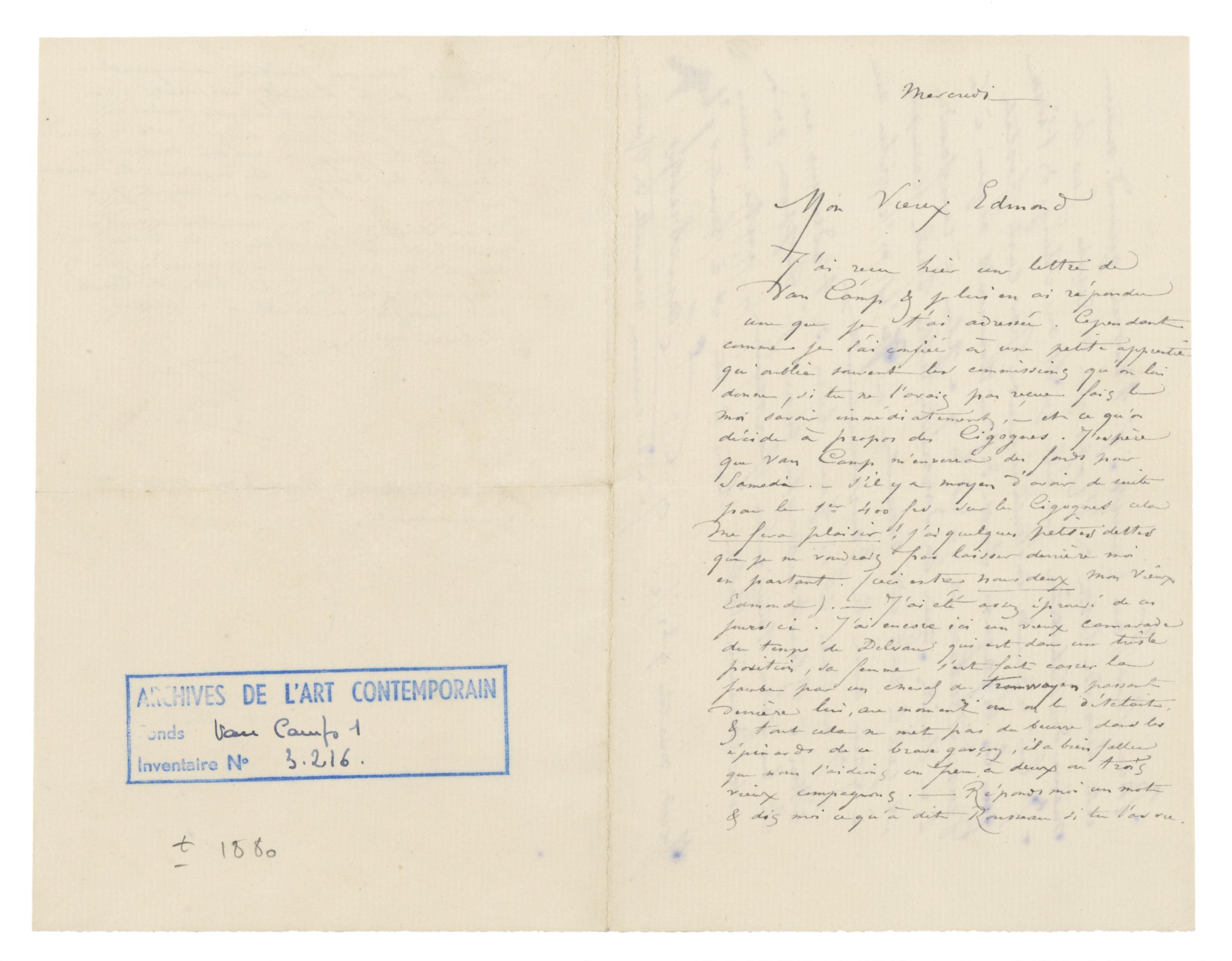 J’ai reçu hier une lettre de Van Camp & je lui en ai répondu une que je t’ai adressée. Cependant comme je l’ai confiée à une petite apprentie qui oublie souvent les commissions qu’on lui donne, si tu ne l’avais pas reçue fais le moi savoir immédiatement. – et ce qu’on décide à propos des Cigognes. J’espère que Van Camp m’enverra des fonds pour Samedi. – S’il y a moyen d’avoir de suite pour le 1er 400 frs sur les Cigognes cela me fera plaisir ! J’ai quelques petites dettes que je ne voudrais pas laisser derrière moi en partant. (ceci entre nous deuxmon vieux Edmond). – J’ai été assez éprouvé de ces jours ci. J’ai encore ici un vieux camarade du temps de Delvau qui est dans une triste position, sa femme s’est fait casser la jambe par un cheval de tramway en passant derrière lui, au moment où on le dételait, & tout cela ne met pas du beurre dans les épinards de ce brave garçon, il a bien fallu que nous l’aidions un peu, à deux ou trois vieux compagnons. – Réponds moi un mot & dis moi ce qu’à dit Rousseau si tu l’as vu.