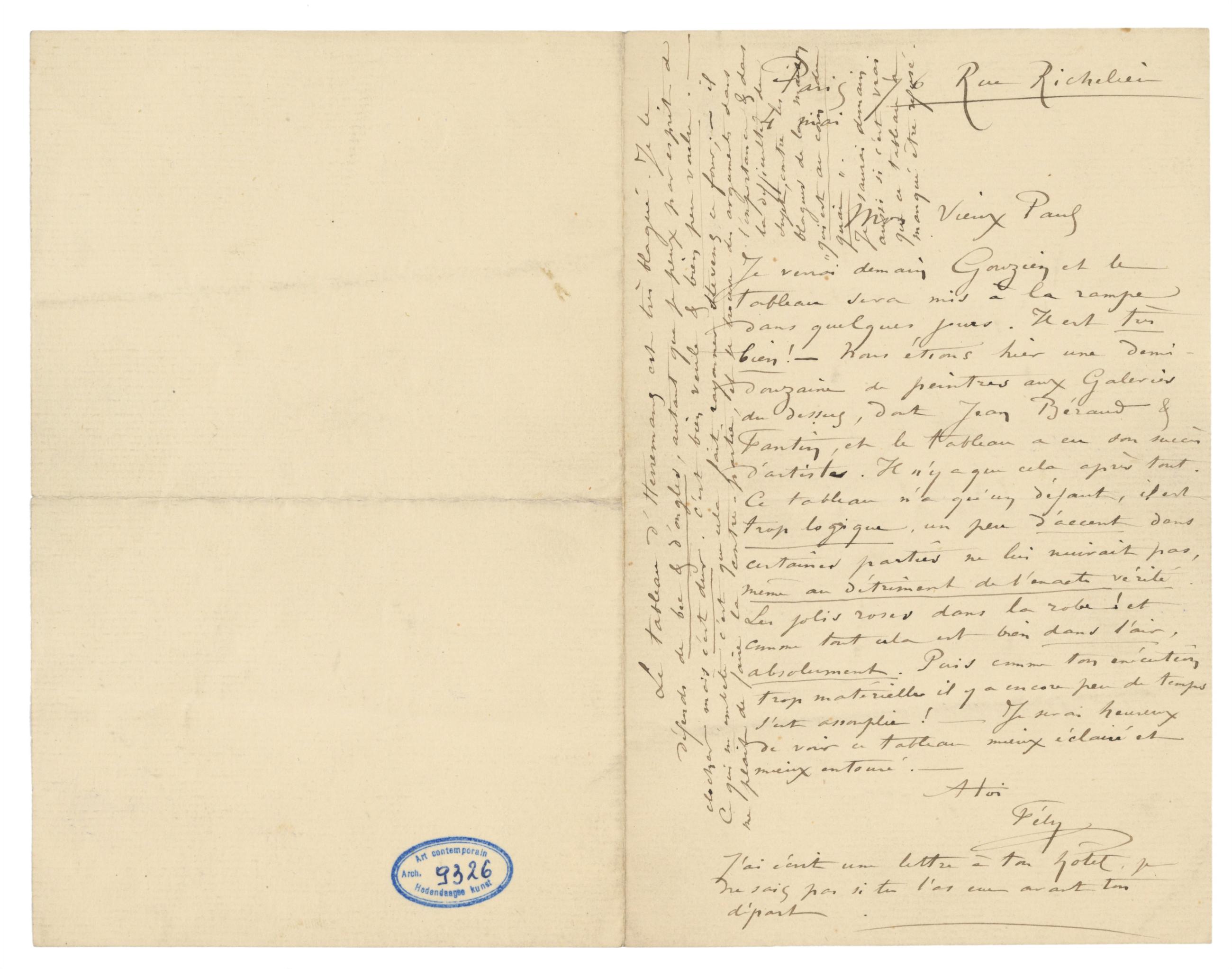 Je verrai demain Gouzien et le tableau sera mis à la rampe dans quelques jours. Il est très bien ! – Nous étions hier une demi-douzaine de peintres aux Galeries du dessus, dont Jean Béraud & Fantin, et le tableau a eu son succès d’artistes. Il n’y a que cela après tout. Ce tableau n’a qu’un défaut, il est trop logique, un peu d’accent dans certaines parties ne lui nuirait pas, même au détriment de l’exacte vérité. Les jolis roses dans la robe ! et comme tout cela est bien dans l’air, absolument. Puis comme ton exécution trop matérielle il y a encore peu de temps s’est assouplie ! – Je serai heureux de voir ce tableau mieux éclairé et mieux entouré. –