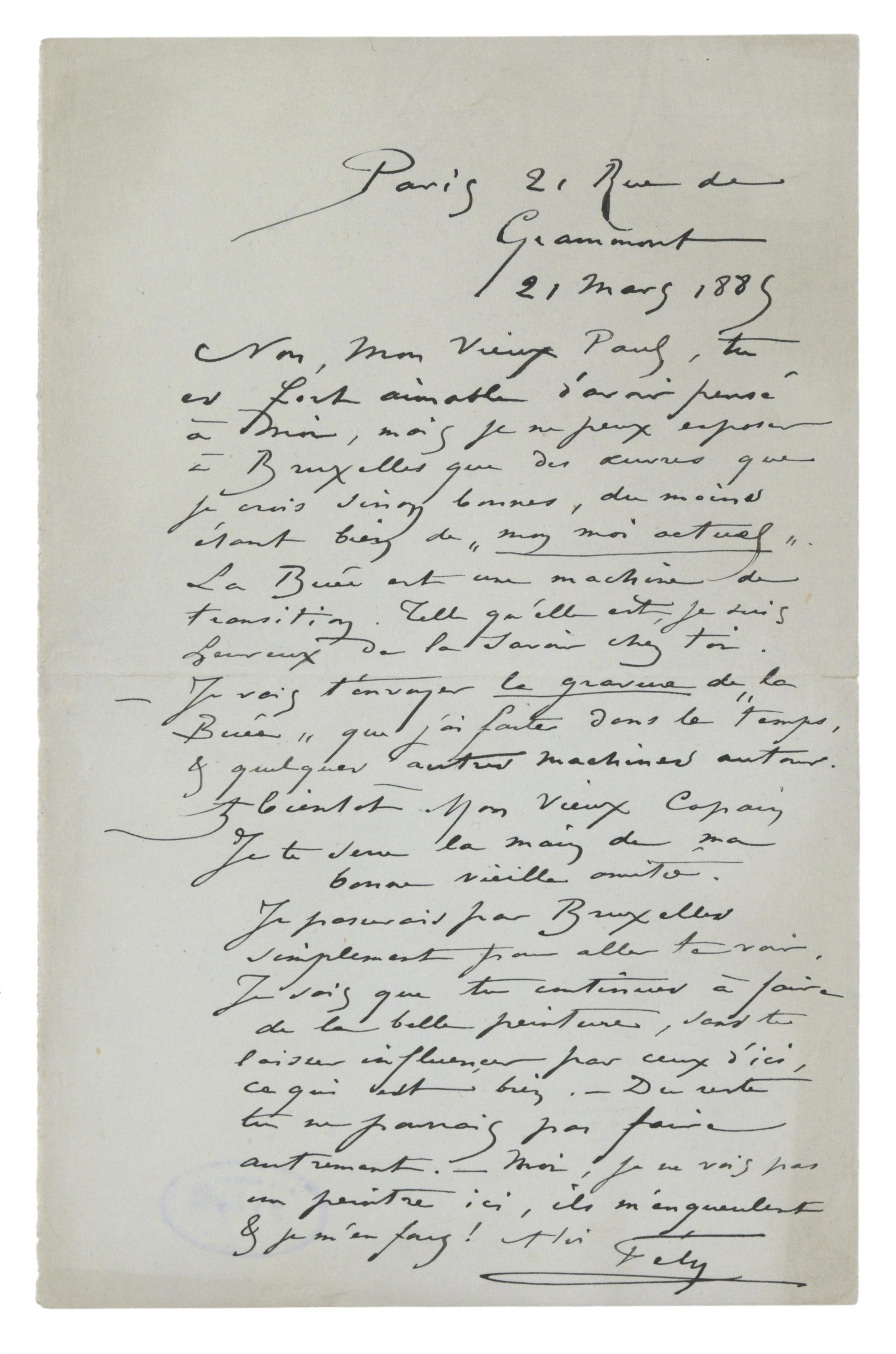 Non, Mon Vieux Paul, tu es fort aimable d’avoir pensé à moi, mais je ne peux exposer à Bruxelles que des œuvres que je crois sinon bonnes, du moins étant bien de « mon moi actuel ». La Buée est une machine de transition. Telle qu’elle est, je suis heureux de la savoir chez toi. – Je vais t’envoyer la gravure de « la Buée » que j’ai faite dans le temps, & quelques autres machines autour. À bientôt. Mon Vieux Copain Je te serre la main de ma bonne vieille amitié.