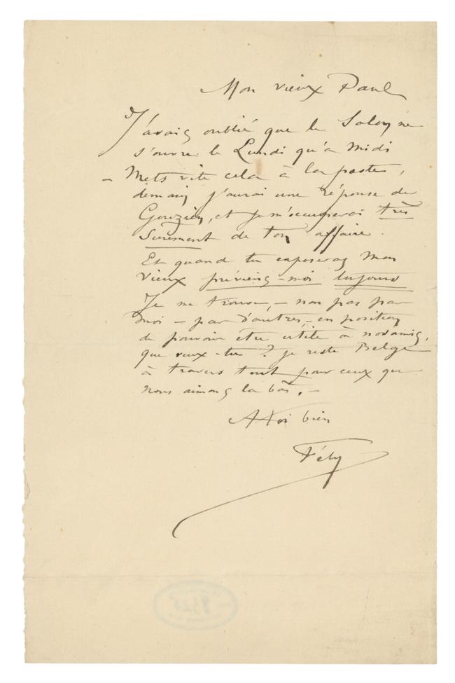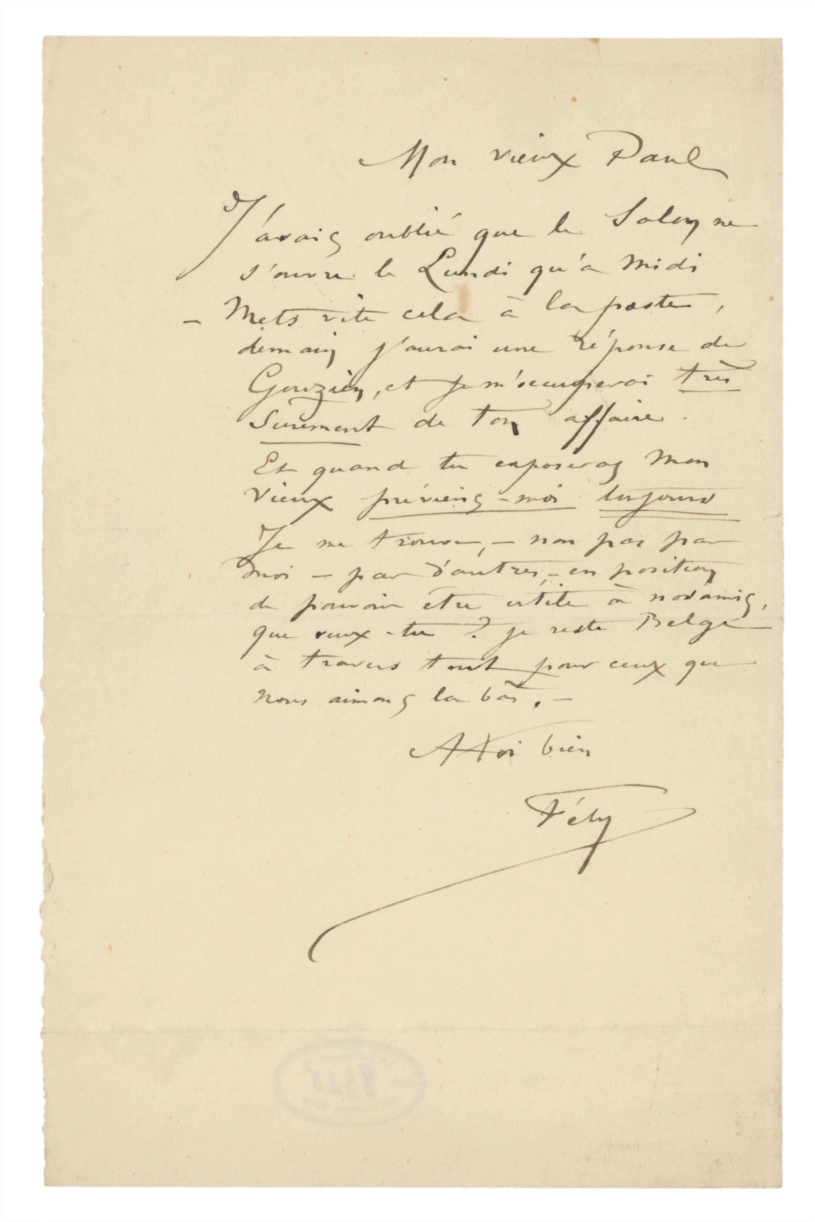 Et quand tu exposeras mon Vieuxpréviens moi toujours Je me trouve, – non pas par moi – par d’autres, – en position de pouvoir être utile à nos amis, que veux-tu ? je reste Belge à travers tout pour ceux que nous aimons la bàs. –