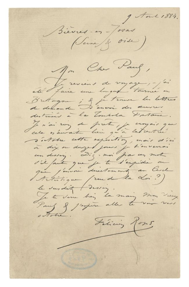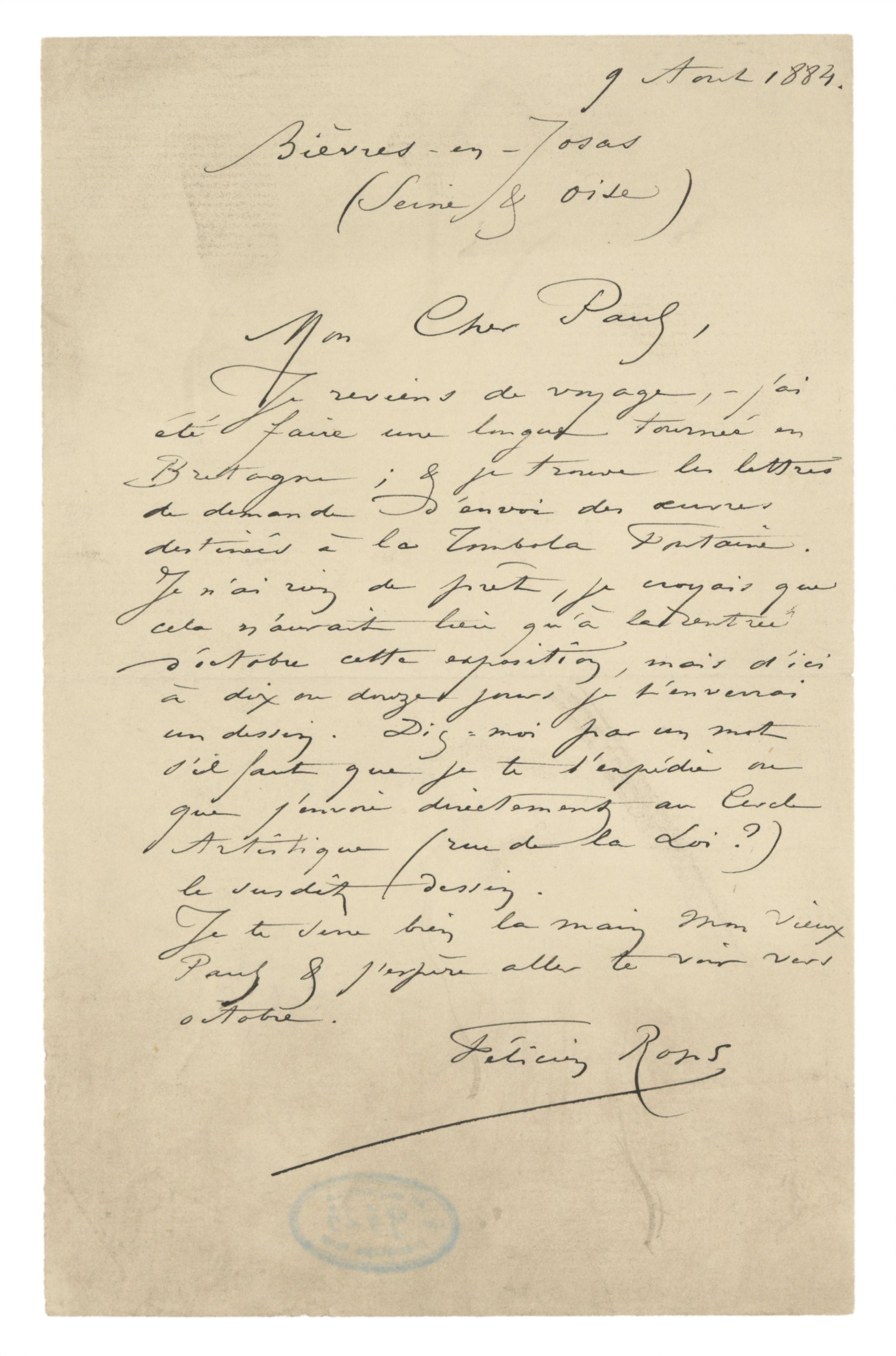 Je reviens de voyage, – j’ai été faire une longue tournée en Bretagne ; & je trouve les lettres de demande d’envoi des œuvres destinées à la Tombola Fontaine. Je n’ai rien de prêt, je croyais que cela n’aurait lieu qu’à la rentrée d’octobre cette exposition, mais d’ici à dix ou douze jours je t’enverrai un dessin. Dis-moi par un mot s’il faut que je te l’expédie ou que j’envoie directement au Cercle Artistique (rue de la Loi ?) le susdit dessin.