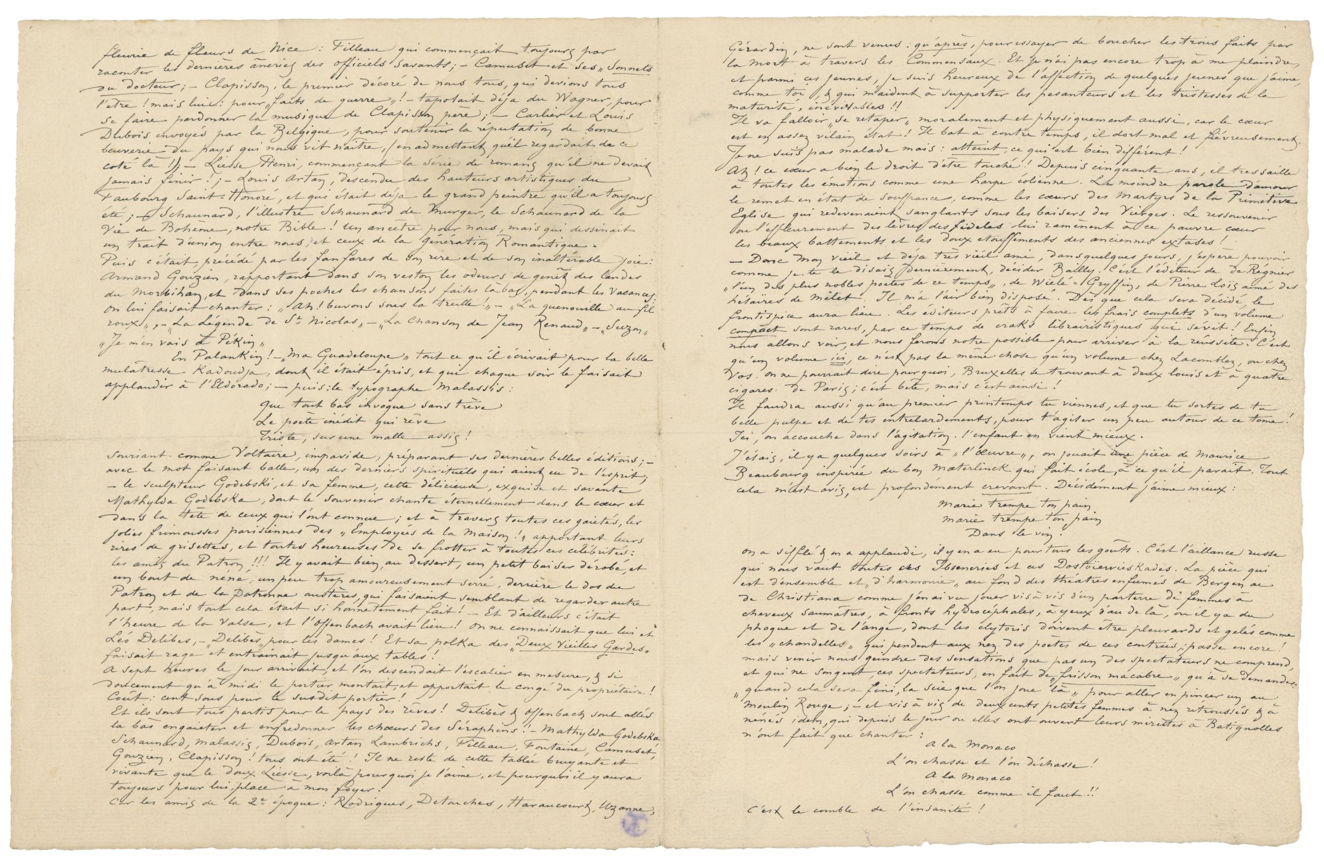 Et ils sont tous partis pour le pays des rêves ! Delibès & Offenbach sont allés la bàs engaieter et enfredonner les chœurs des Séraphins ! – Mathylda Godebska, Schaunard, Malassis, Dubois, Artan, Lambrichs, Filleau, Fontaine, Camuset, Gouzien, Clapisson ! tous ont été ! Il ne reste de cette tablée bruyante et vivante que le doux Liesse, voilà pourquoi je l’aime, et pourquoi il y aura toujours pour lui place à mon foyer.