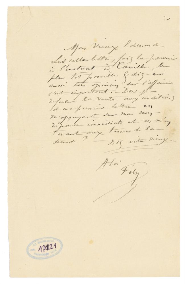 Lis cette lettre, fais la parvenir à l’instant à Camille, le plus tôt possible & dis-moi aussi ton opinion sur l’affaire c’est important. – Dois-je refuser la vente aux conditions de ma première lettre en m’appuyant sur ma non-réponse immédiate et en m’en tenant aux termes de la seconde ?