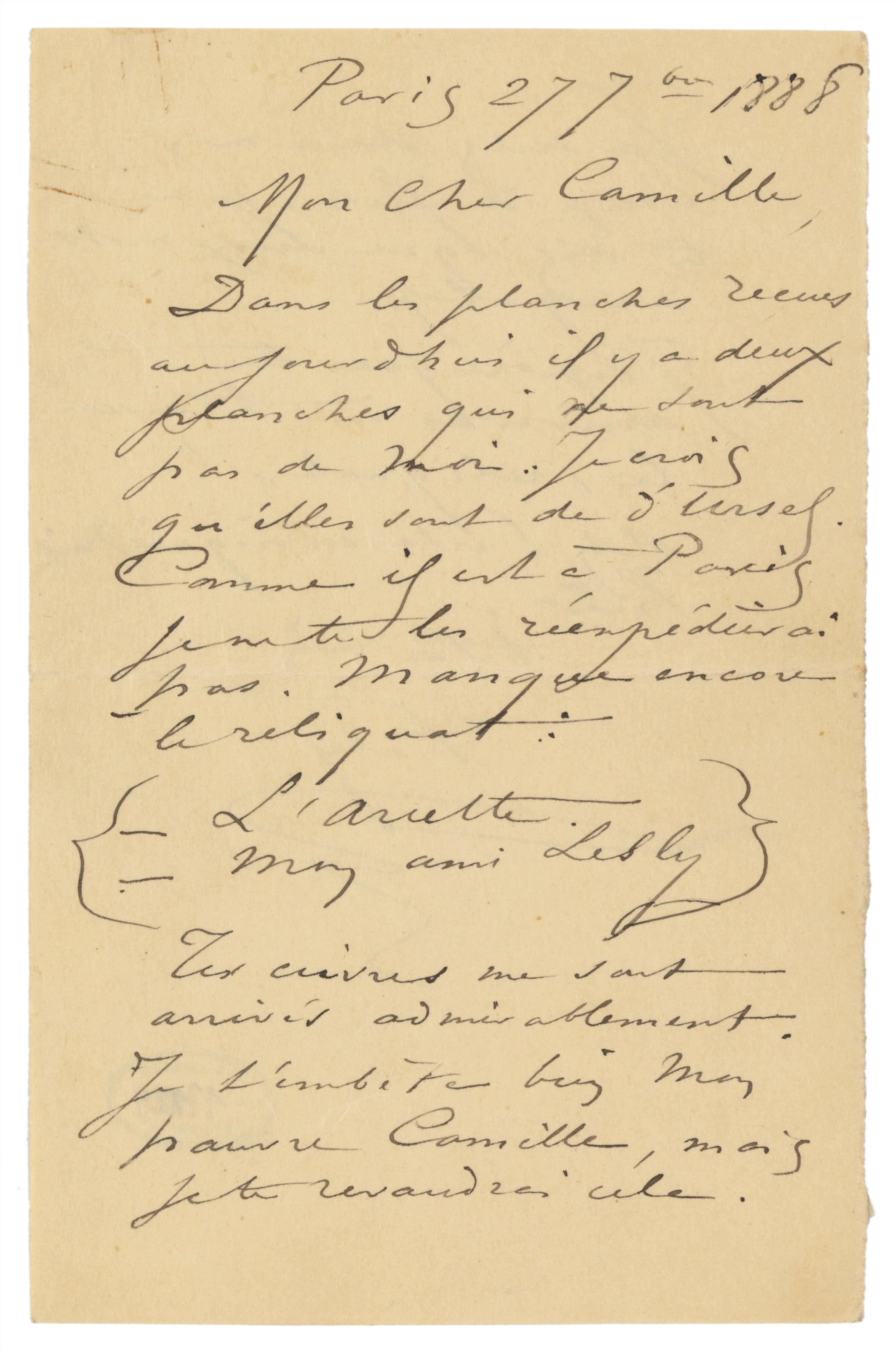 Tes cuivres me sont arrivés admirablement. Je t’embête bien mon pauvre Camille, mais je te revaudrai cela.