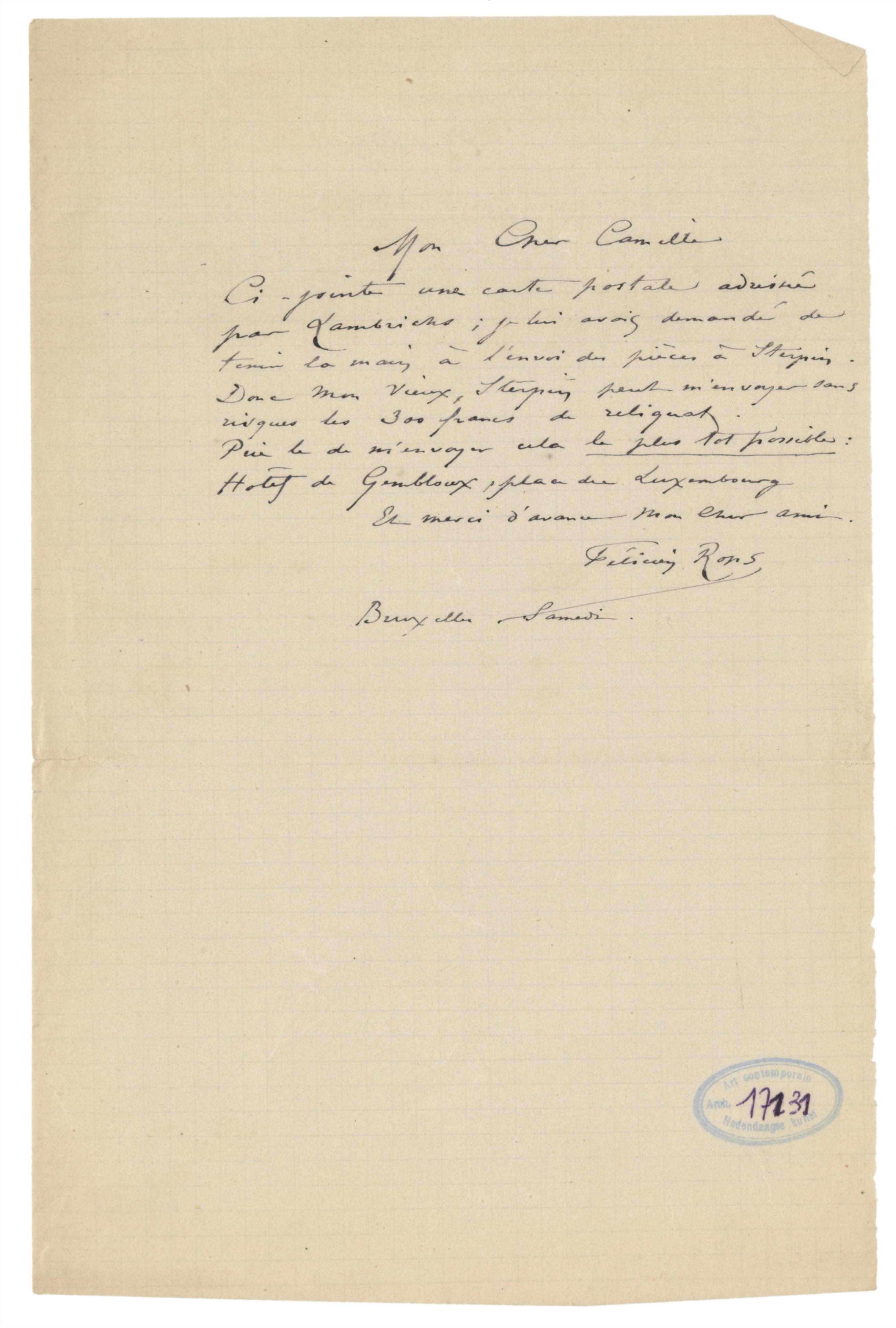 Ci-jointe une carte postale adressée par Lambrichs ; je lui avais demandé de tenir la main à l’envoi des pièces à Sterpin. Donc mon vieux, Sterpin peut m’envoyer sans risques les 300 francs de reliquat.