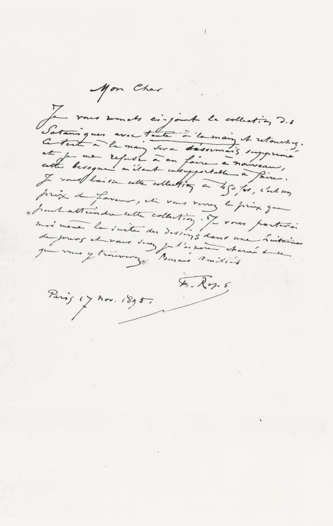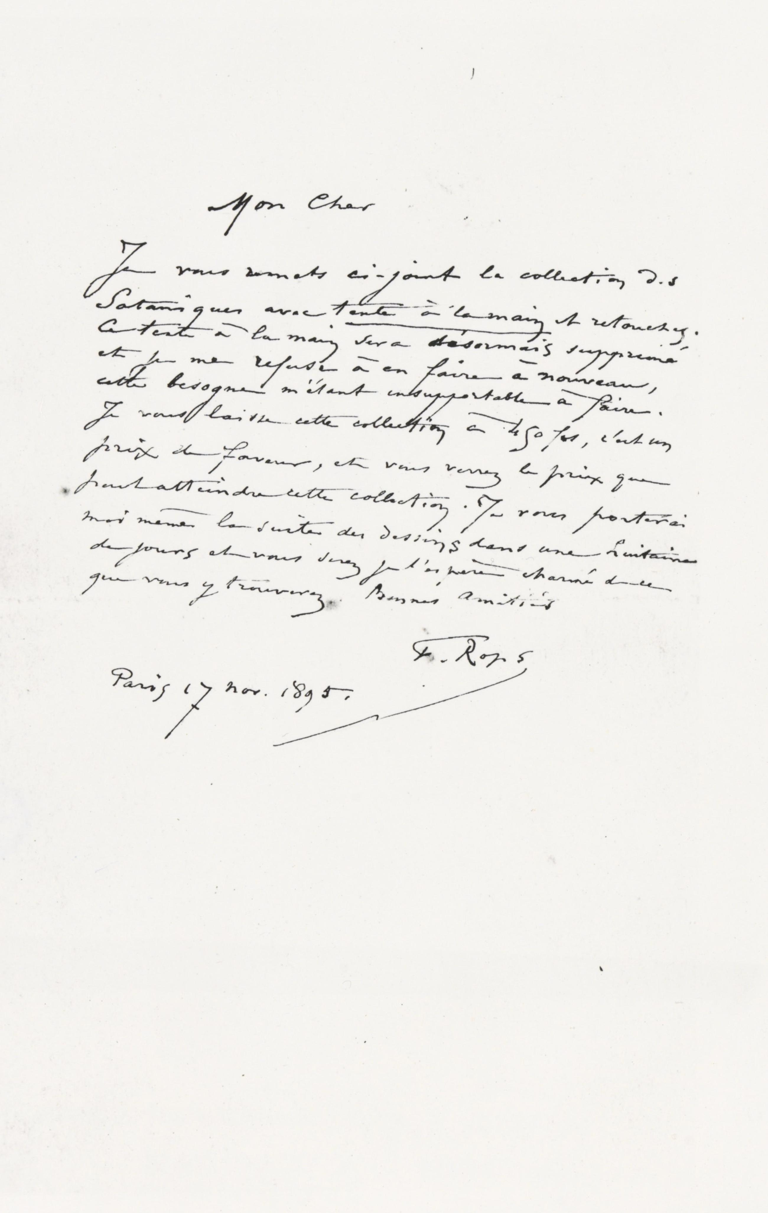 Je vous remets ci-joint la collection des Sataniques avec texte à la main et retouches. Ce texte à la main sera désormais supprimé et je me refuse à en faire à nouveau cette besogne m’étant insupportable à faire. Je vous laisse cette solution à 450 frs, c’est un prix de faveur, et vous verrez le prix que peut atteindre cette collection. Je vous porterai moi même la suite des dessins dans une huitaine de jours et vous serez je l’espère charmé de ce que vous y trouverez.