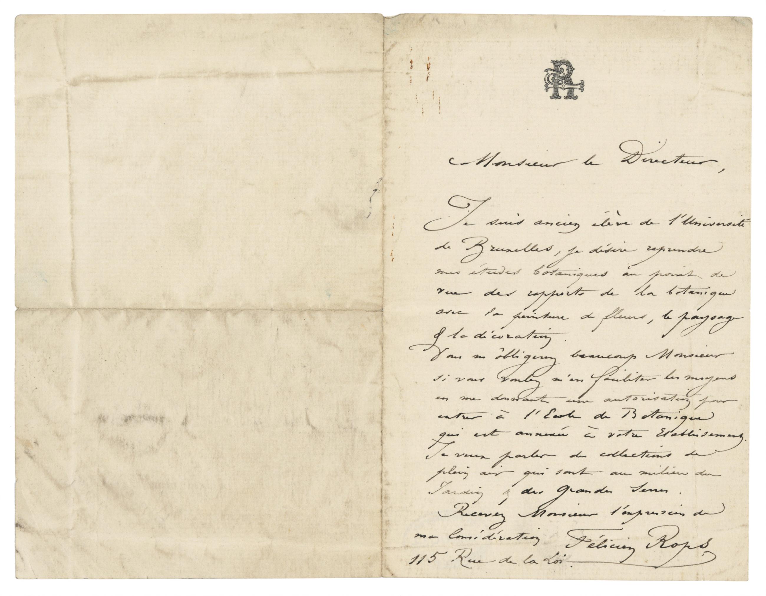 Vous m’obligerez beaucoup Monsieur si vous voulez m’en faciliter les moyens en me donnant une autorisation pour entrer a l’École de Botanique qui est annexée à votre Établissement. Je veux parler des collections de plein air qui sont au milieu du Jardin & des Grandes Serres.