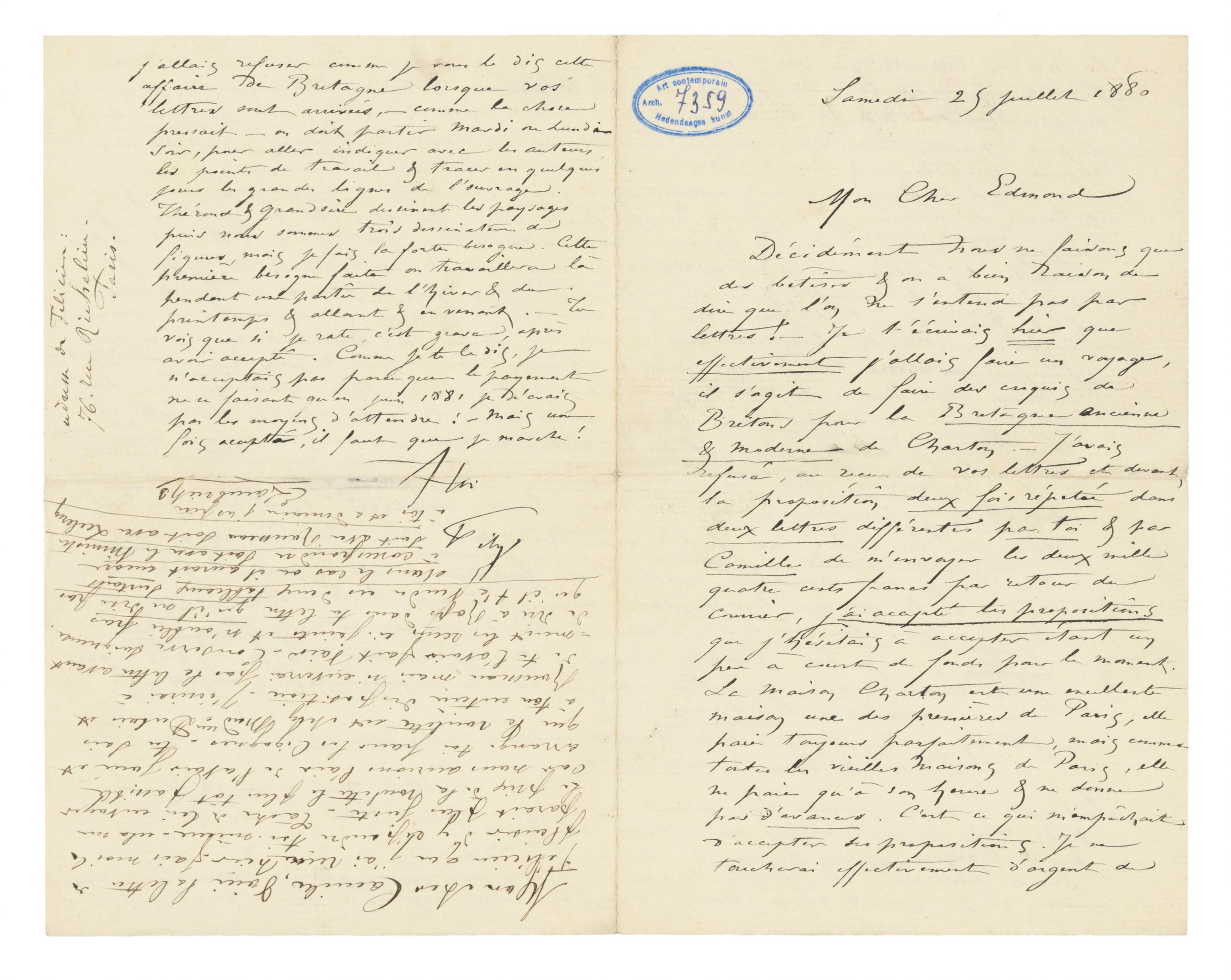 Décidément nous ne faisons que des bêtises & on a bien raison de dire que l’on ne s’entend pas par lettres! – Je t’écrivais hier que effectivement j’allais faire un voyage, il s’agit de faire des croquis de Bretons pour la Bretagne ancienne & moderne de Charton. – J’avais refusé, au reçu de vos lettres et devant, la proposition deux fois répétée dans deux lettres différentes par toi & par Camille de m’envoyer les deux mille quatre cents francs par retour du courrier, j’ai accepté les propositions que j’hésitais à accepter étant un peu à court de fonds pour le moment. La Maison Charton est une excellente maison une des premières de Paris, elle paie toujours parfaitement, mais comme toutes les vieilles Maisons de Paris, elle ne paie qu’à son heure & ne donne pas d’avances. C’est ce qui m’empêchait d’accepter ses propositions. Je ne toucherai effectivement d’argent de
