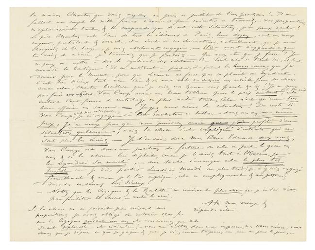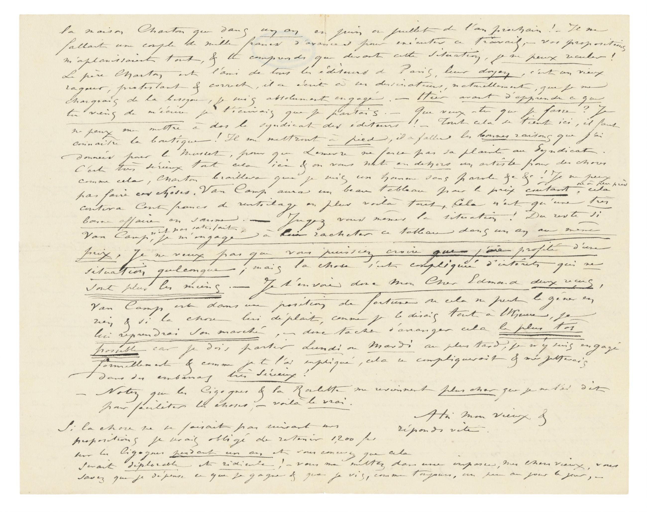 Si la chose ne se faisait pas suivant mes propositions je serais obligé de retenir 1,200 frs sur les Cigognespendant un an et vous concevez que cela serait déplorable et ridicule ! – Vous me mettez dans une impasse, mon cher vieux, vous savez que je dépense ce que je gagne & que je vis, comme toujours, un peu au jour le jour, –
