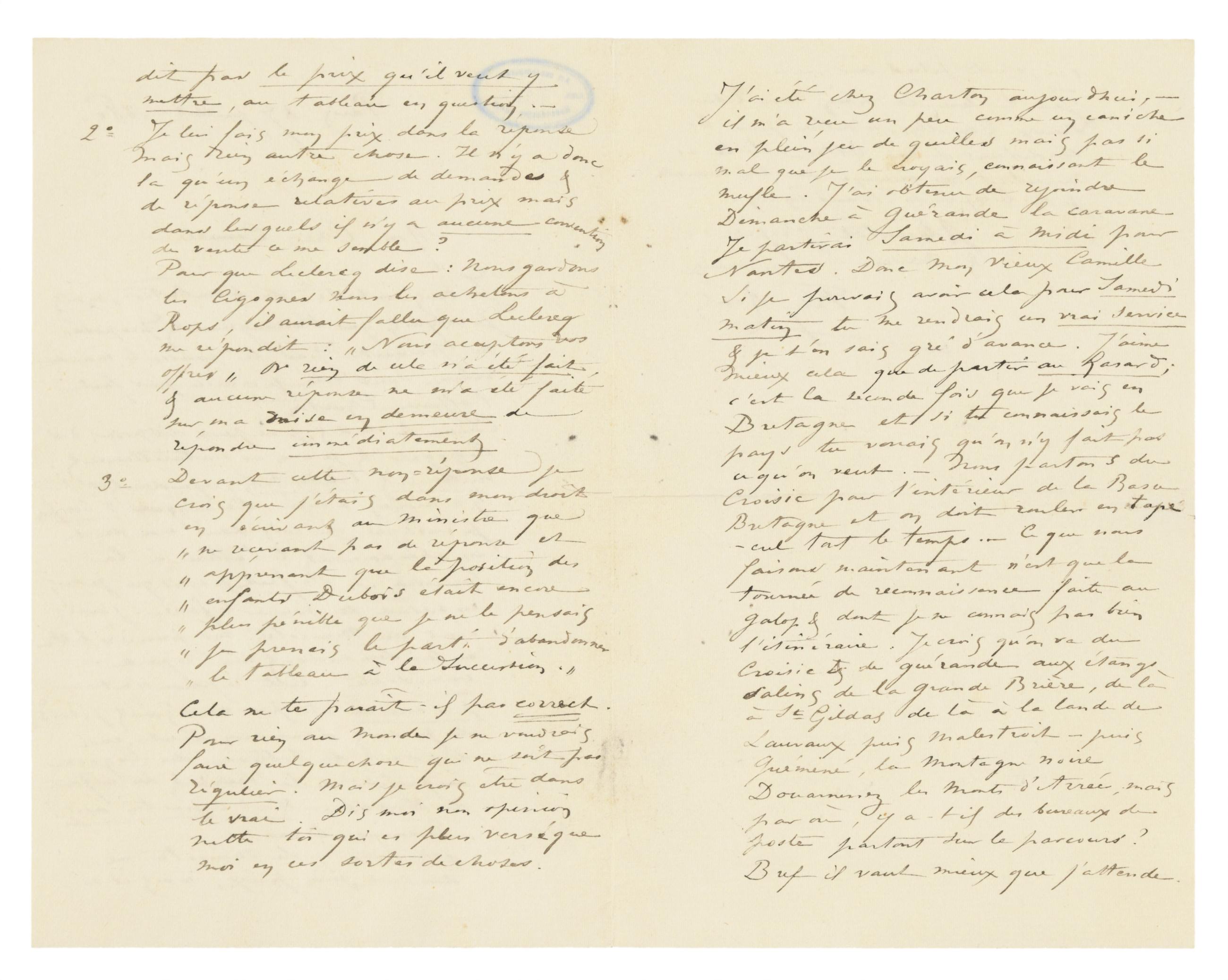 Comme tu le dis, je ne peux disposer des Cigognes & je n’en ai naturellement nullement l’intention ; cependant s’il y a moyen d’avoir d’avangque 2.600 frs, je crois que je suis dans mon droit en abandonnant le tableau à la Succession. – De fait je crois que je suis en mesure de pouvoir le faire: j’avais écrit au Ministre ma première lettre en lui demandant une réponse immédiate. Cette réponse n’est pas arrivée et par conséquent j’étais et je suis dans mon droit en disposant du tableau des Cigognes au profit de la Veuve & des enfants de Dubois. – N’est ce pas ton avis?