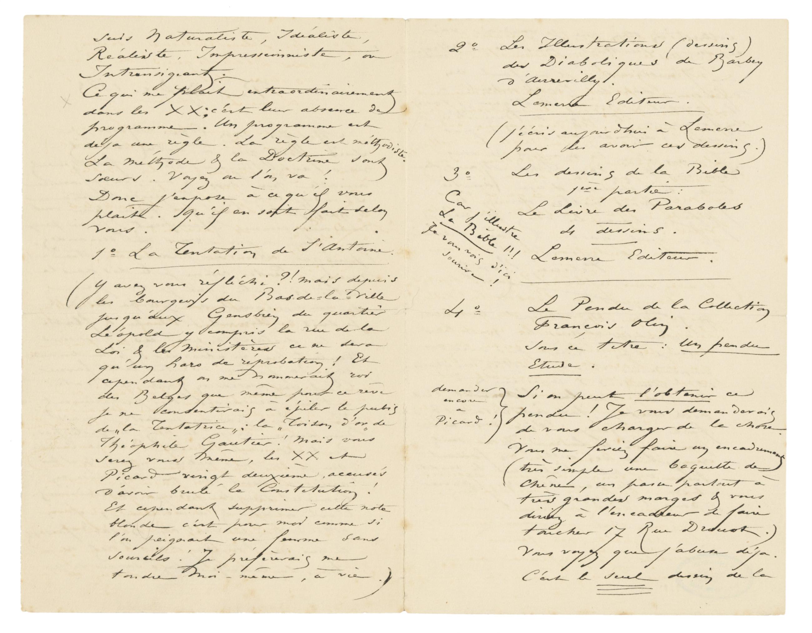 (Y avez vous réfléchi ?! Mais depuis les bourgeois du Bas-de-la-Ville jusqu’aux Gensbien du quartier Léopold y compris la rue de la Loi, & les Ministères ce ne sera qu’un haro de réprobation ! Et cependant on me nommerait roi des Belges que même pour ce rêve je ne consentirais à épiler le pubis de « la Tentatrice » : la « Toison d’or» de Théophile Gautier ! Mais vous serez vous-même, les XX et Picard vingt deuxième, accusés d’avoir brûlé la Constitution ! Et cependant supprimer cette note blonde c’es pour moi comme si l’on peignait une femme sans sourcils ! Je préfèrerais me tondre moi-même, à vie.)