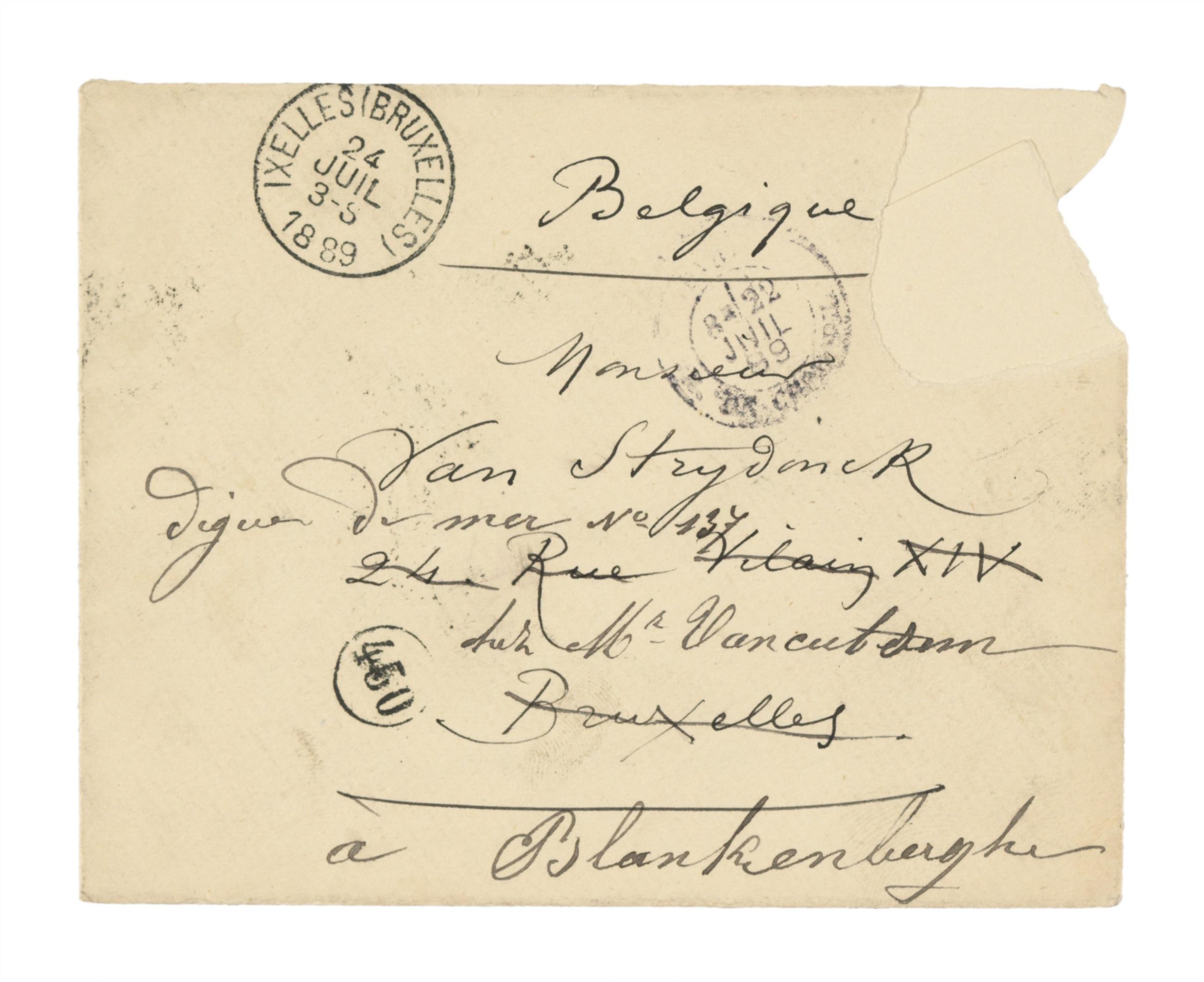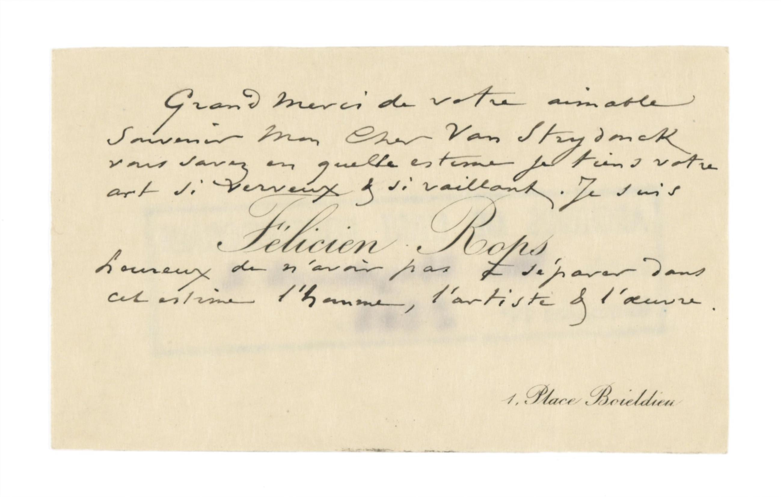 Grand merci de votre aimable souvenir Mon Cher Van Strydonck vous savez en quelle estime je tiens votre art si verveux & si vaillant. Je suis heureux de n’avoir pas à séparer dans cette estime l’homme, l’artiste & l’œuvre.