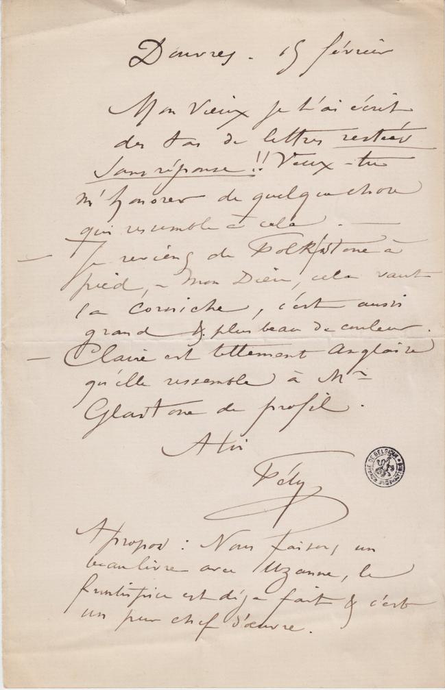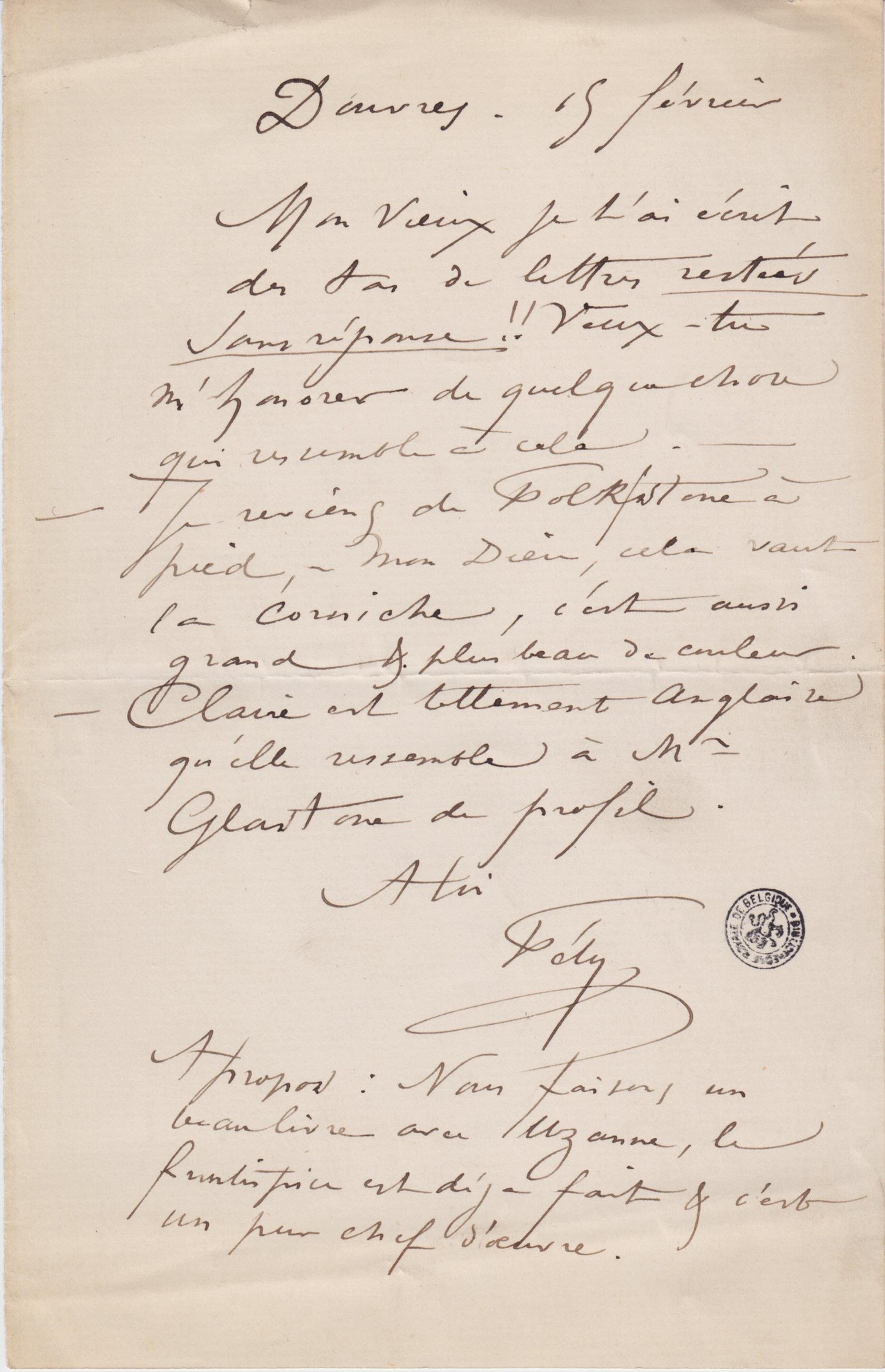 – Je reviens de Folk stone à pied, – Mon Dieu, cela vaut la corniche, c’est aussi grand & plus beau de couleur.