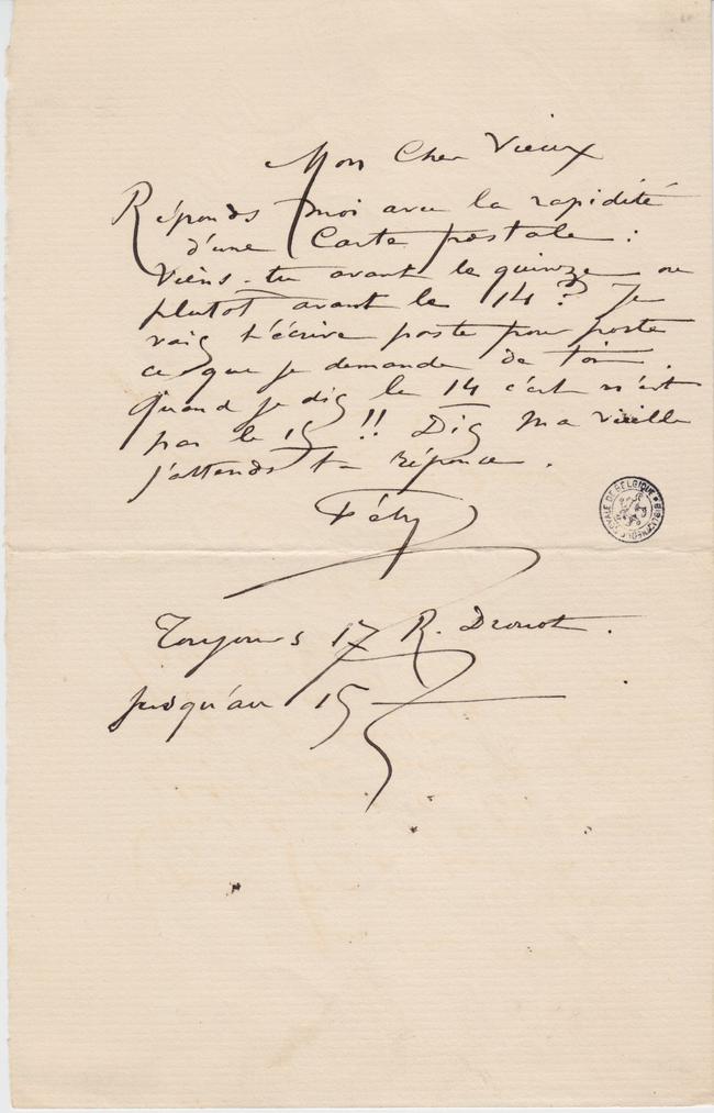 Réponds moi avec la rapidité d’une Carte postale : Viens-tu avant le quinze ou plutôt avant le 14 ? Je vais t’écrire poste pour poste ce que je demande de toi. Quand je dis le 14 c’est n’est pas le 15 !! Dis Ma Vieille j’attends ta réponse.