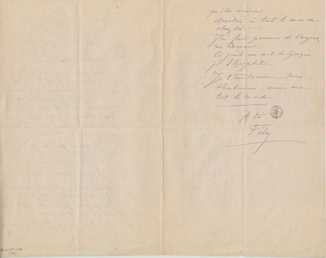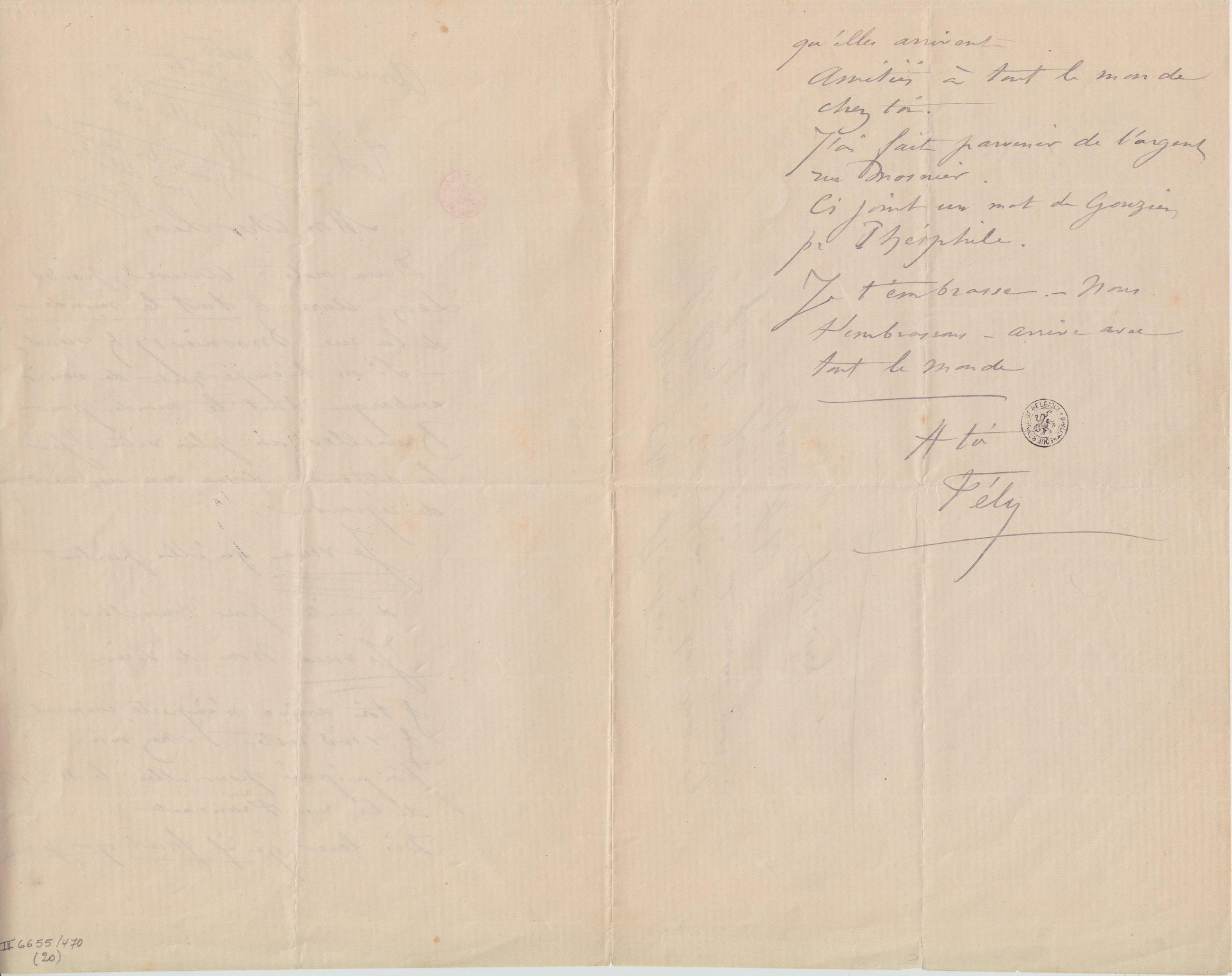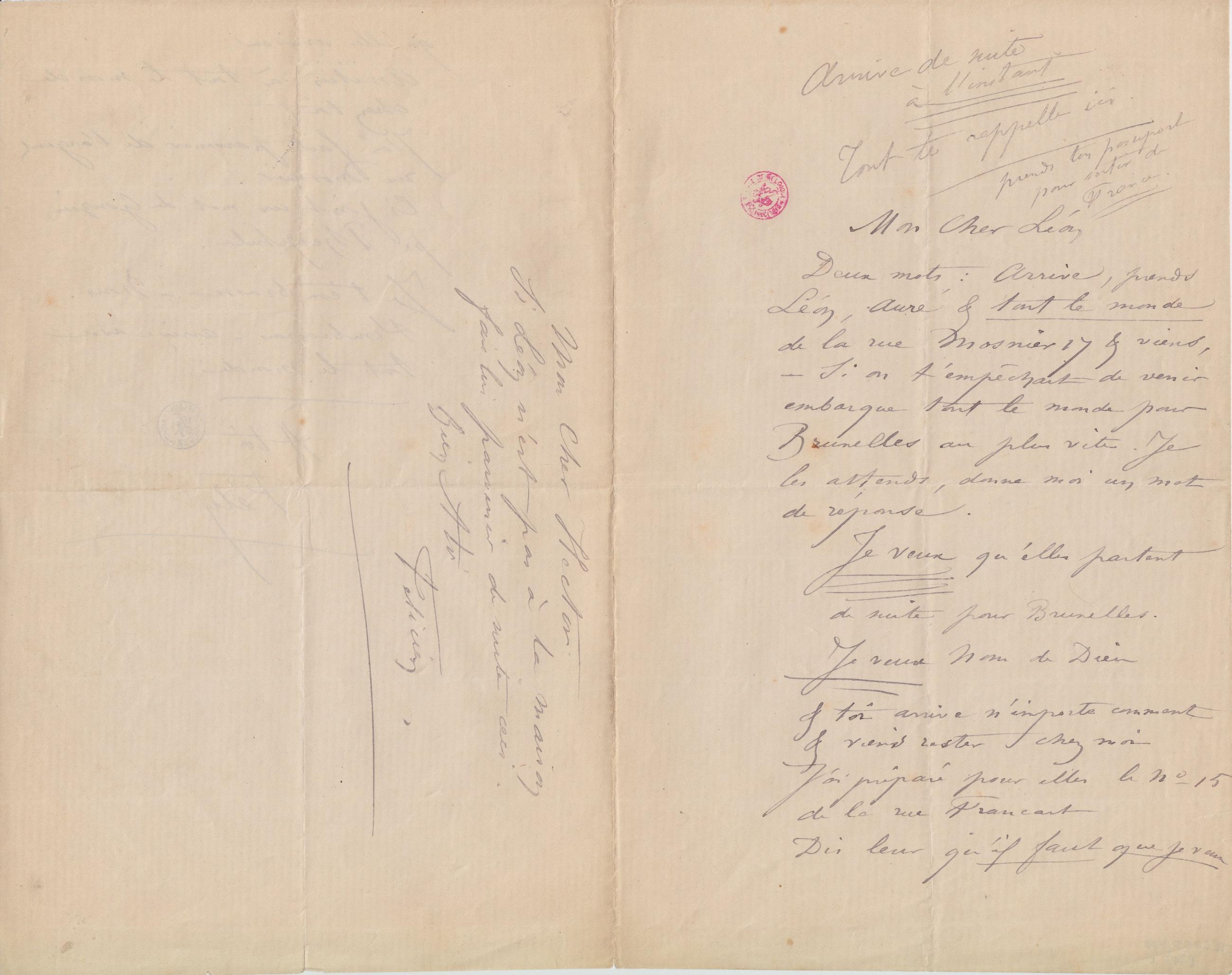 Deux mots : Arrive, prends Léon, Auré & tout le monde de la rue Mosnier 17 & viens, – Si on t’empêchait de venir embarque tout le monde pour Bruxelles au plus vite. Je les attends, donne moi un mot de réponse.