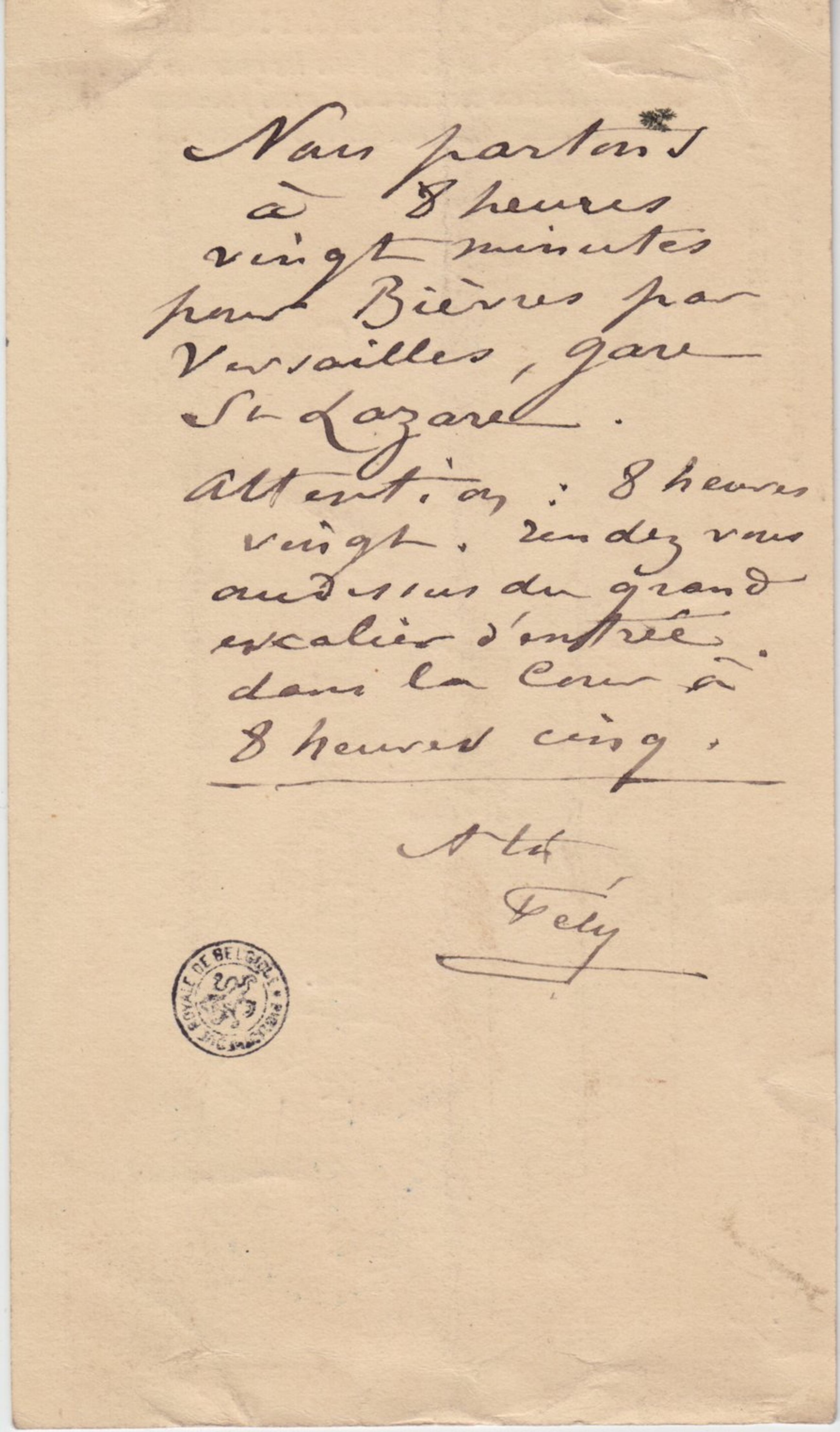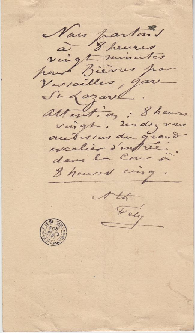 Nous partons à 8 heures vingt minutes pour Bièvres par Versailles, gare St Lazare.
