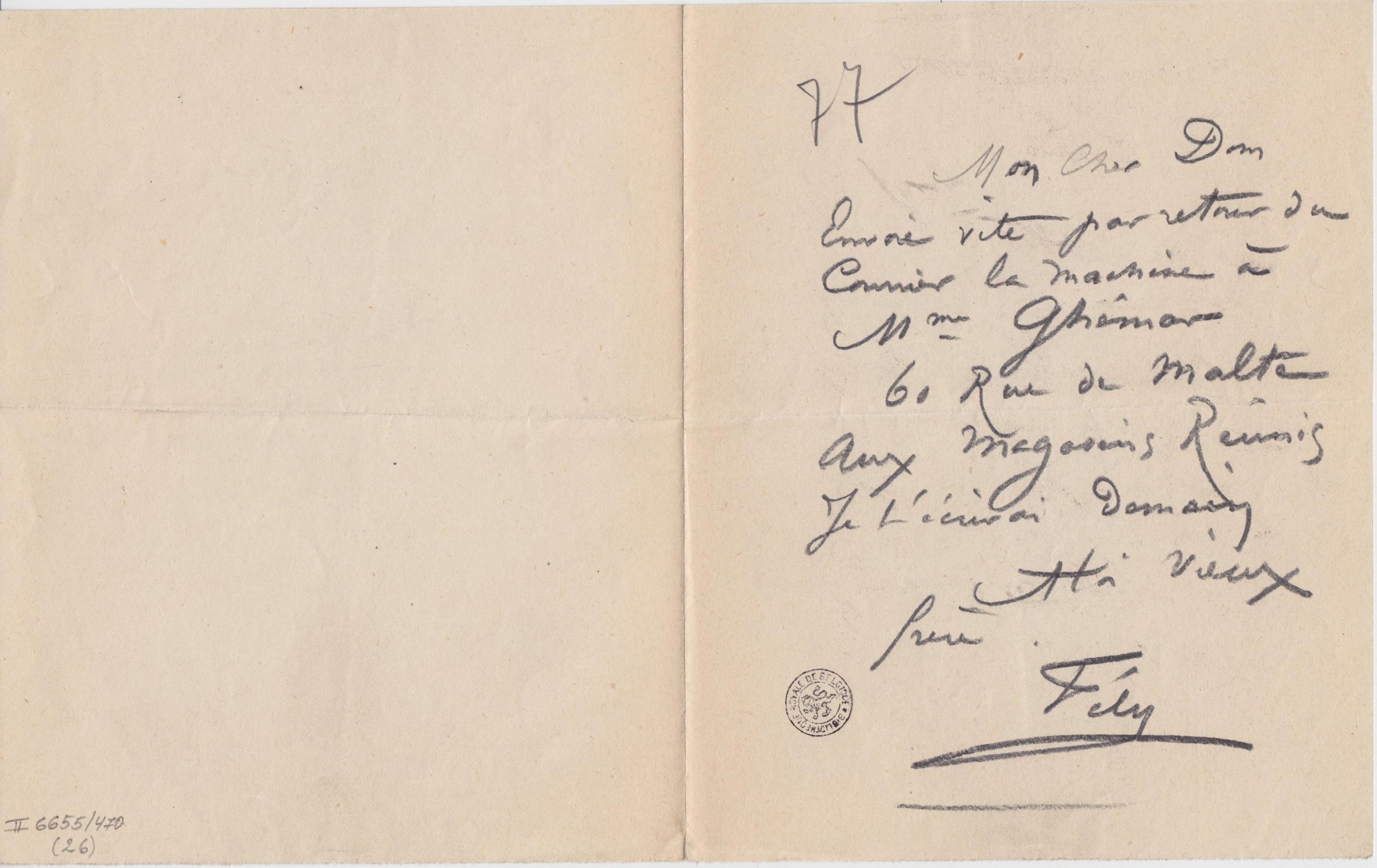 Envoi vite par retour du courrier la machine à Mme Ghémar