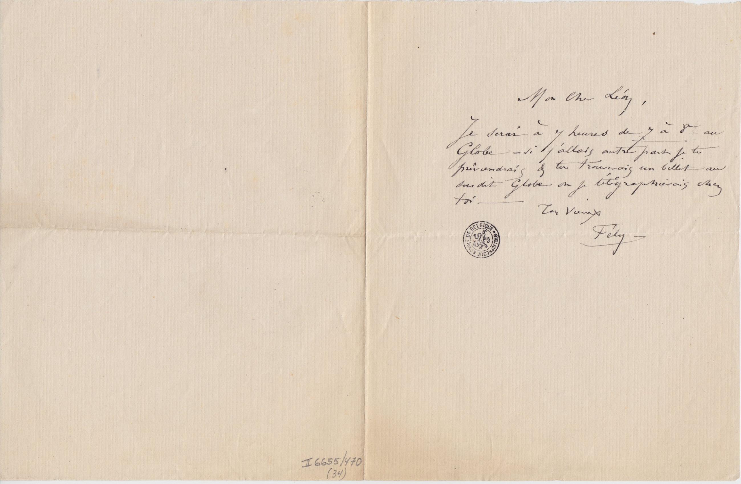 Je serai à 7 heures de 7 à 8 au Globe – si j’allais autre part je te préviendrais & tu trouverais un billet au susdit Globe ou je télégraphierais chez toi –