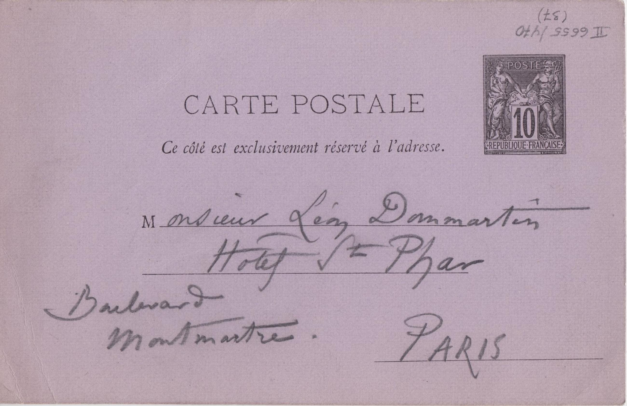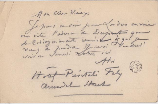 Je pars ce soir pour Londres envoie-moi vite l’adresse de Dupont que de Roddaz m’avait remise & que je viens de perdre Je serai Vendredi soir ou Samedi matin ici