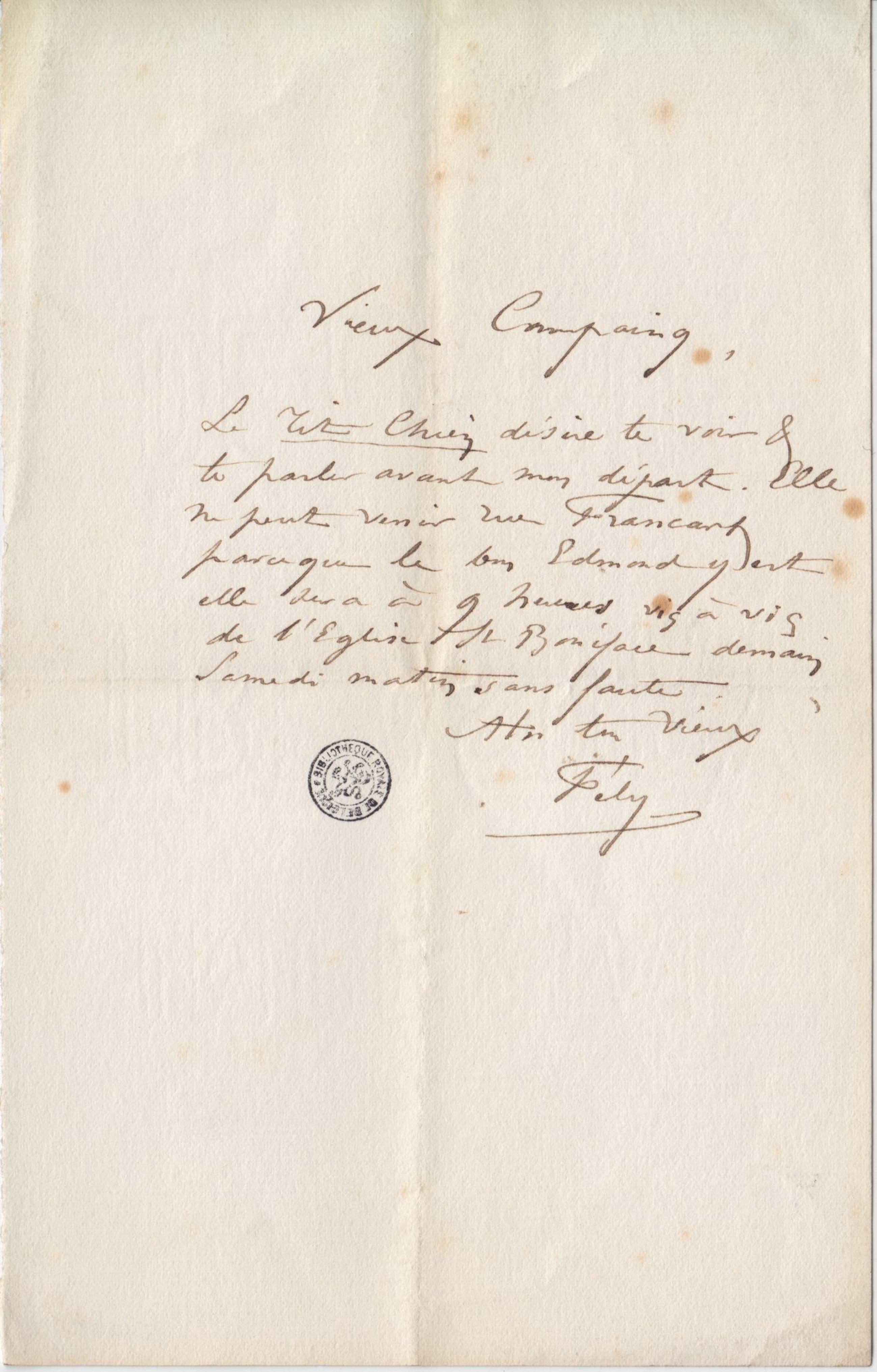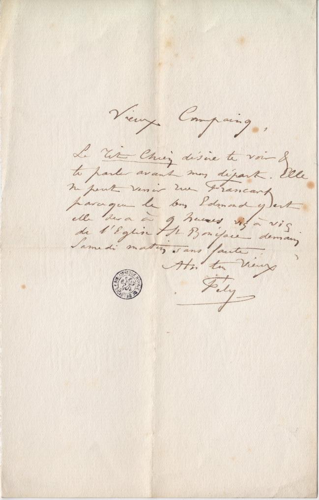 Le Tit Chien désire te voir & te parler avant mon départ. Elle ne peut venir rue Francart parceque le bon Edmond y est elle sera à 9 heures vis à vis de l’Église St Boniface demain Samedi matin sans faute.