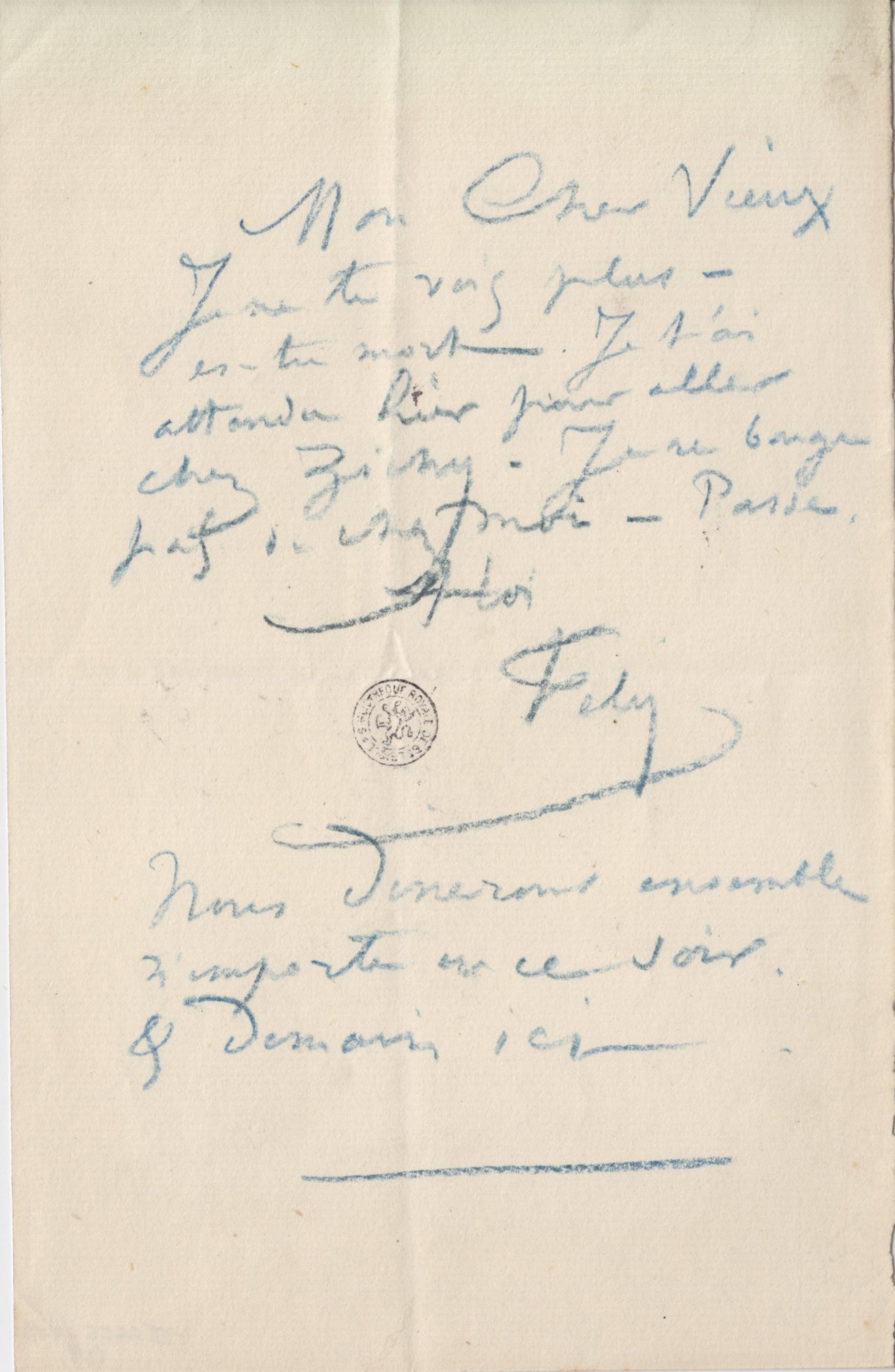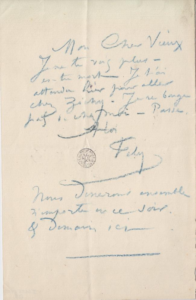 Je te vois plus – es-tu mort. Je t’ai attendu hier pour aller chez Zichy. Je ne bouge pas de chez moi – Passe.