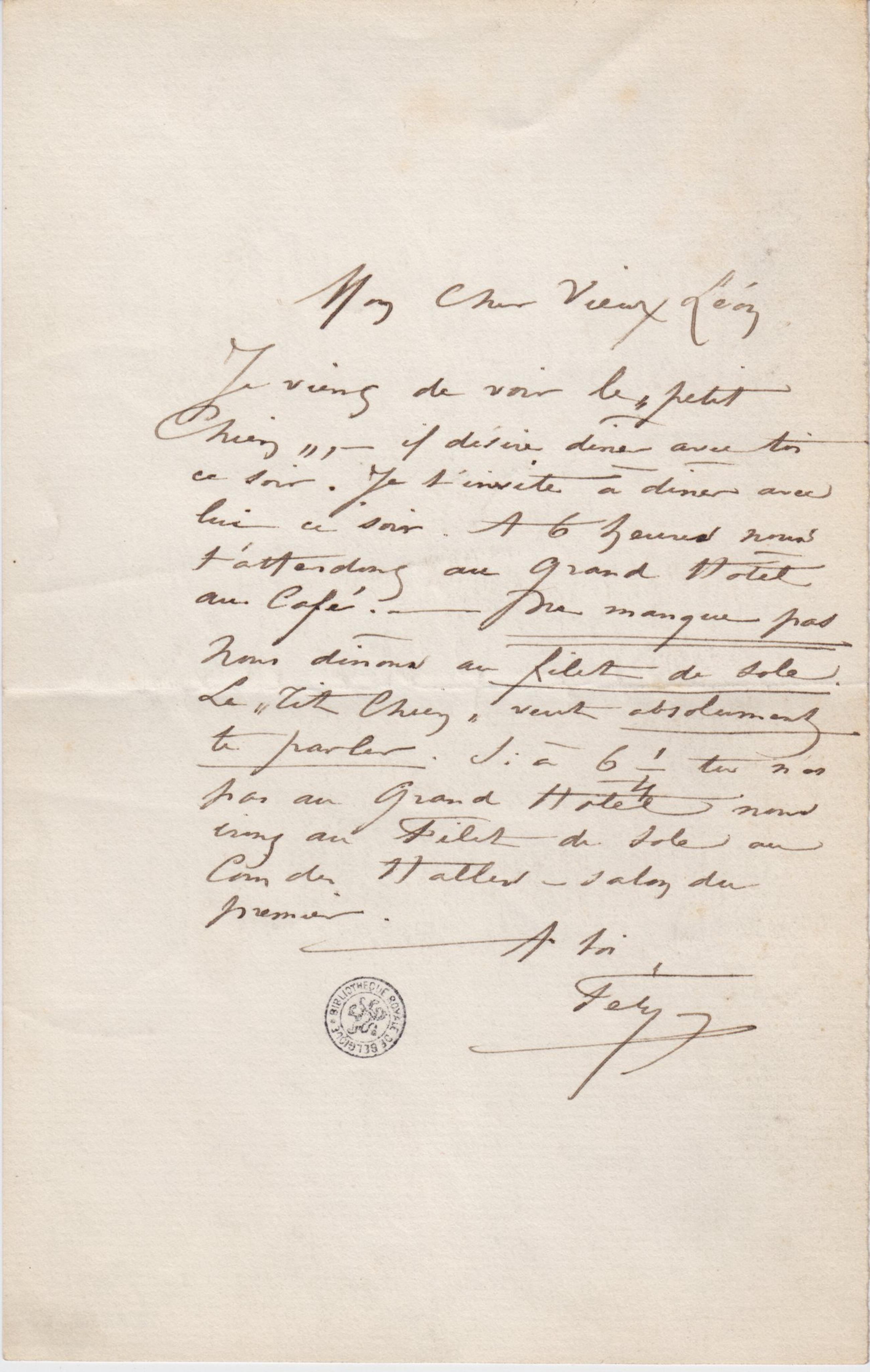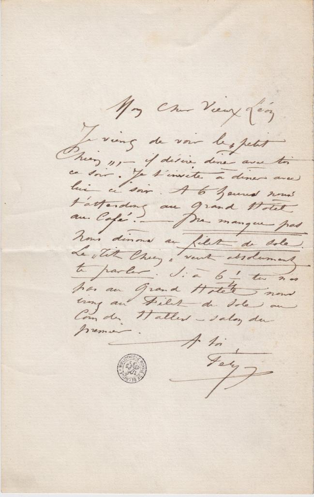 Je viens de voir le « petit Chien », – il désire dîner avec toi ce soir. Je t’invite à dîner avec lui ce soir. À 6 heures nous t’attendons au Grand Hôtel au Café. – Ne manque pas Nous dînons au filet de sole. Le « Tit Chien » veut absolument te parler. Si à 6 ¼ tu n’es pas au Grand Hôtel nous irons au Filet de Sole au Coin des Halles – salon du premier.