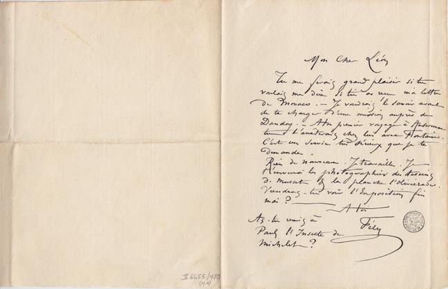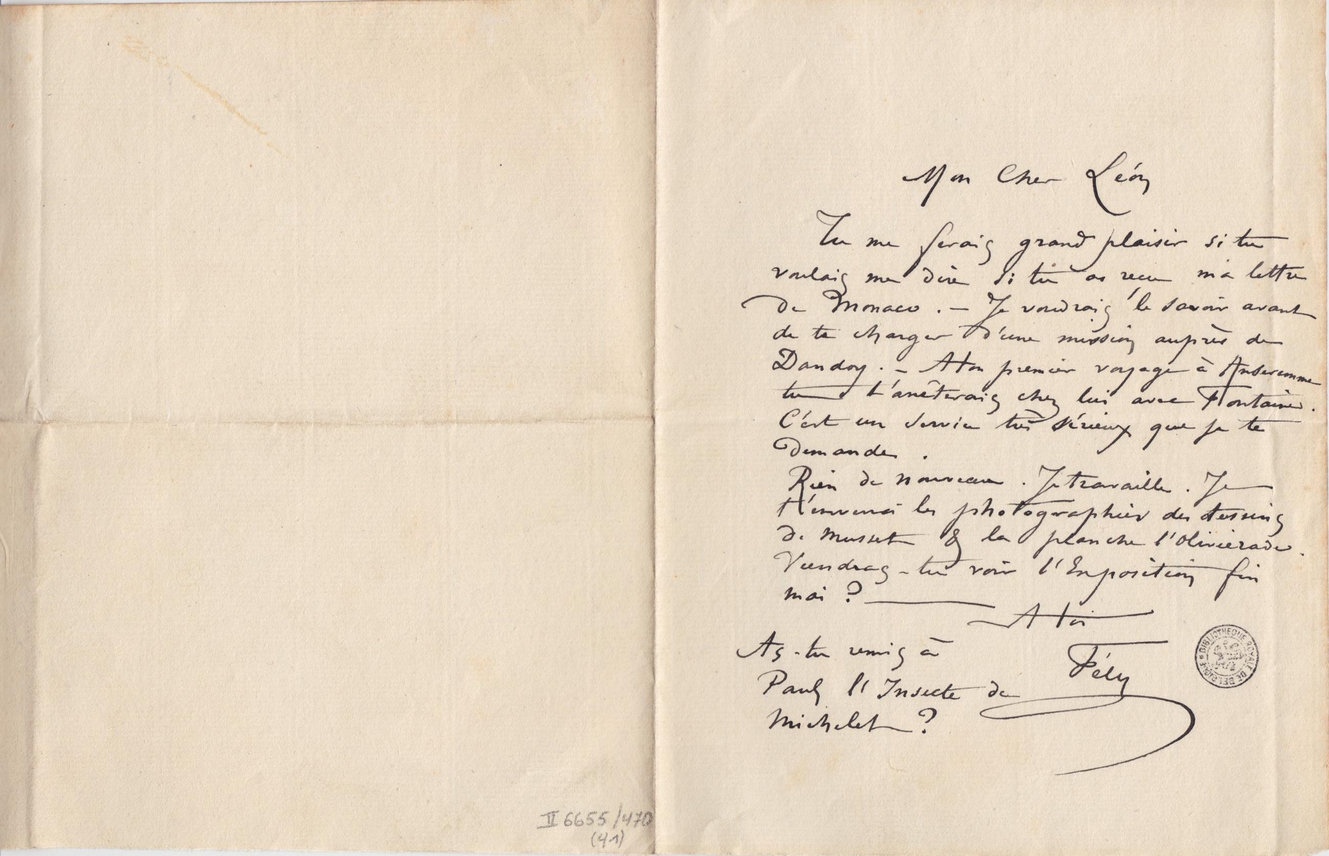 Rien de nouveau. Je travaille. Je t’enverrai les photographies des dessins de Musset & la planche l’Olivierade. Viendras-tu voir l’Exposition fin mai ? –